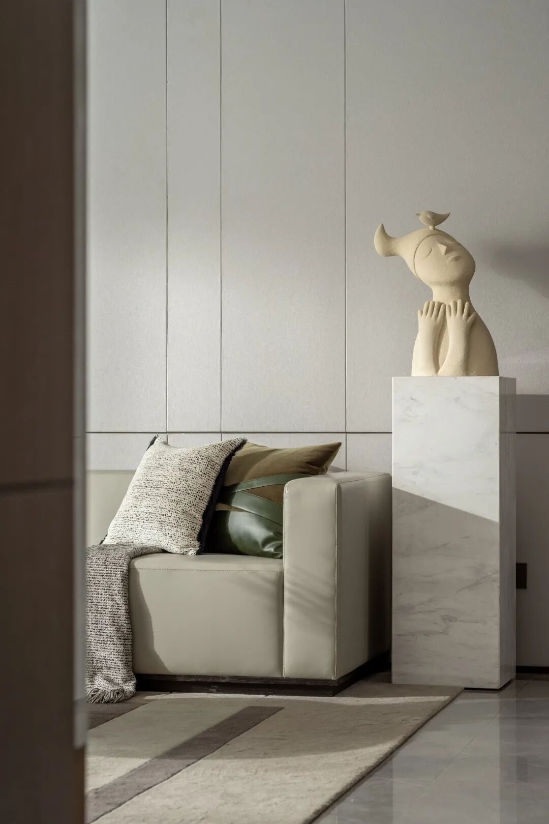 主卧依旧延续极简的设计风格,大面积的米色为屋主人打造了一个温馨舒适的居住空间,床头的黄色灯带增添了室内空间的温暖氛围,提升了整体空间的质感,线条感十足的床头装饰展现了现代主义下的几何美感。 "TIME MEMORY" 胶片的记忆,即是时间流动的证明 胶片是记录,也是生活 如同一首浪漫的爵士乐 法式优雅是一段浪漫随性的曲调 慵懒中带着经典而迷人的韵味 AOD设计循着这一定调,在这套时尚感与艺术性兼具的装饰风格与当代都市生活相融,以细腻而生动的描摹,表达菁英阶层的审美品味与生活方式。 设计的开篇,AOD设计将空间陈设与风格美学完美融合。客厅在白色大理石墙面的背景下,突显浪漫与经典。暖橘色的皮质沙发、金属框架的玻璃茶几、颇具个性的艺术摆件,构成了一幅摩登的美学画面。 奢华常常与富裕混为一谈,AOD认为对奢华的理解更应该展现在匠人的手工工艺上,精心诠释了故事的真实感。在空间中,真实而有温度,是一种极致品质。 都市理想生活的营造,不拘泥于某一种风格、装饰与元素的堆砌,而是强调空间品位与生活方式的导入,透过设计传达内涵的空间精神,以此表达鲜活的都市灵魂。音乐,一曲浪漫优雅的爵士乐,便是这套空间设计的自由与精神。