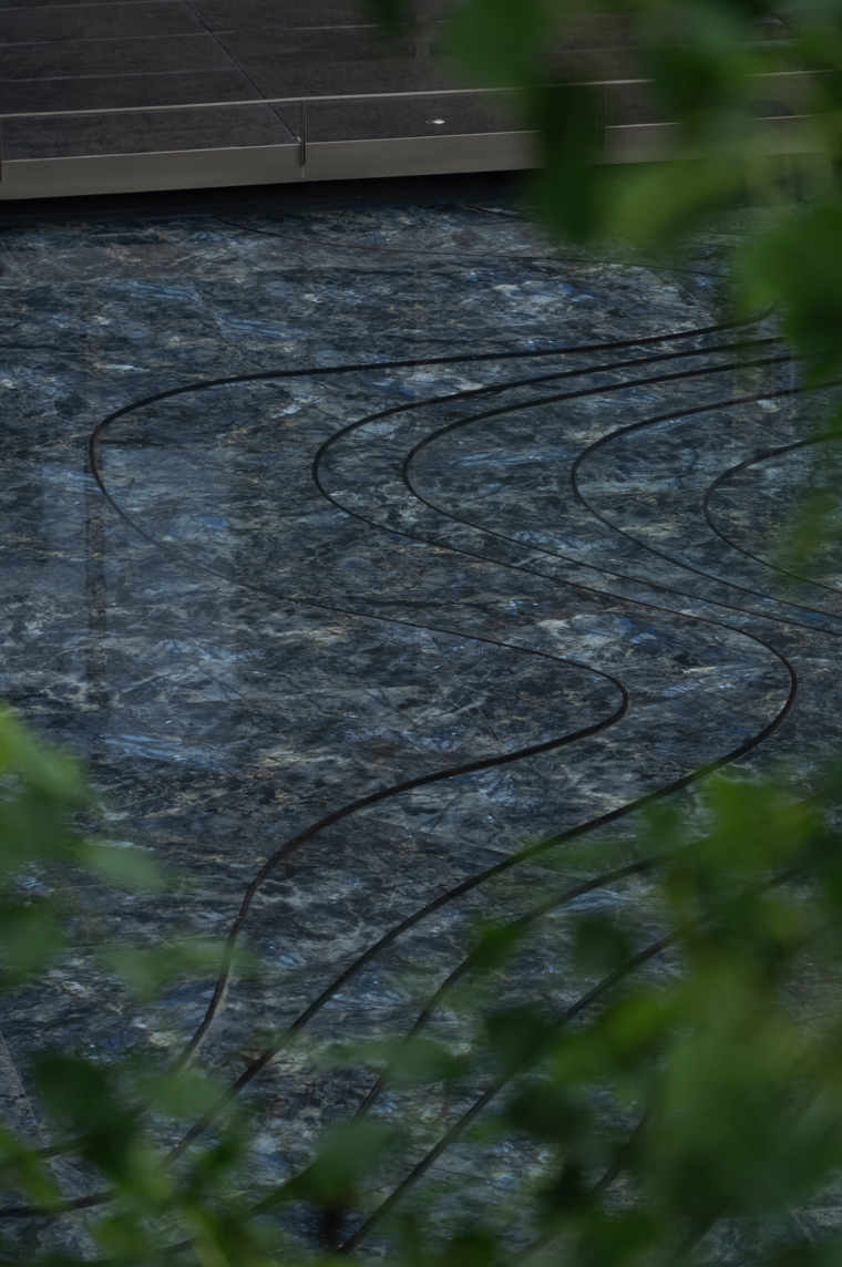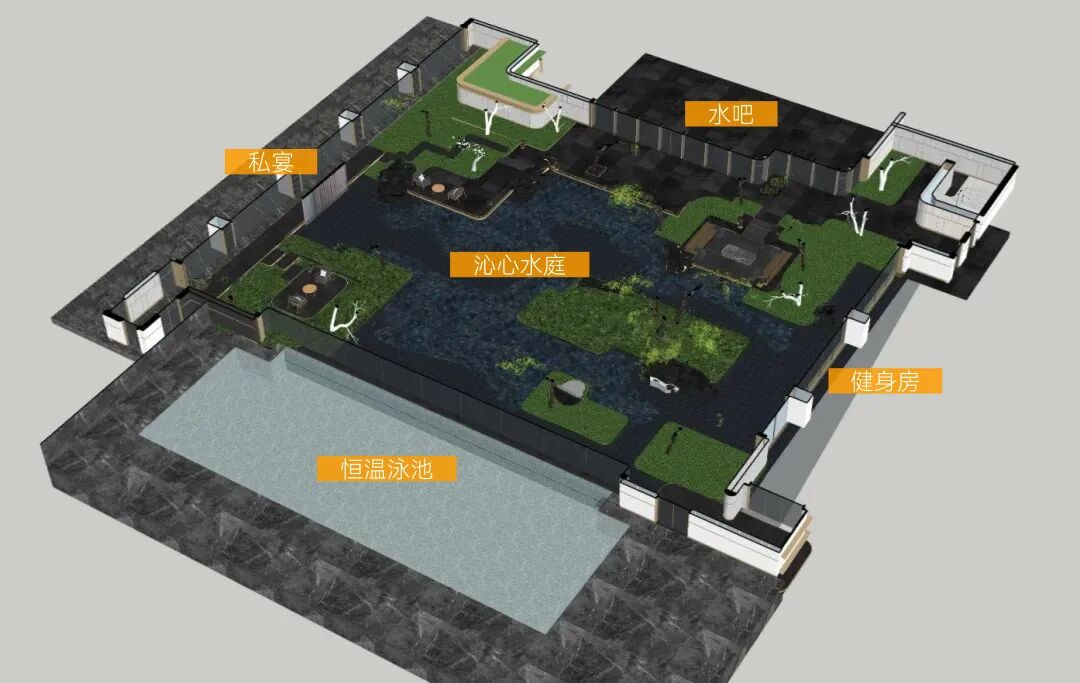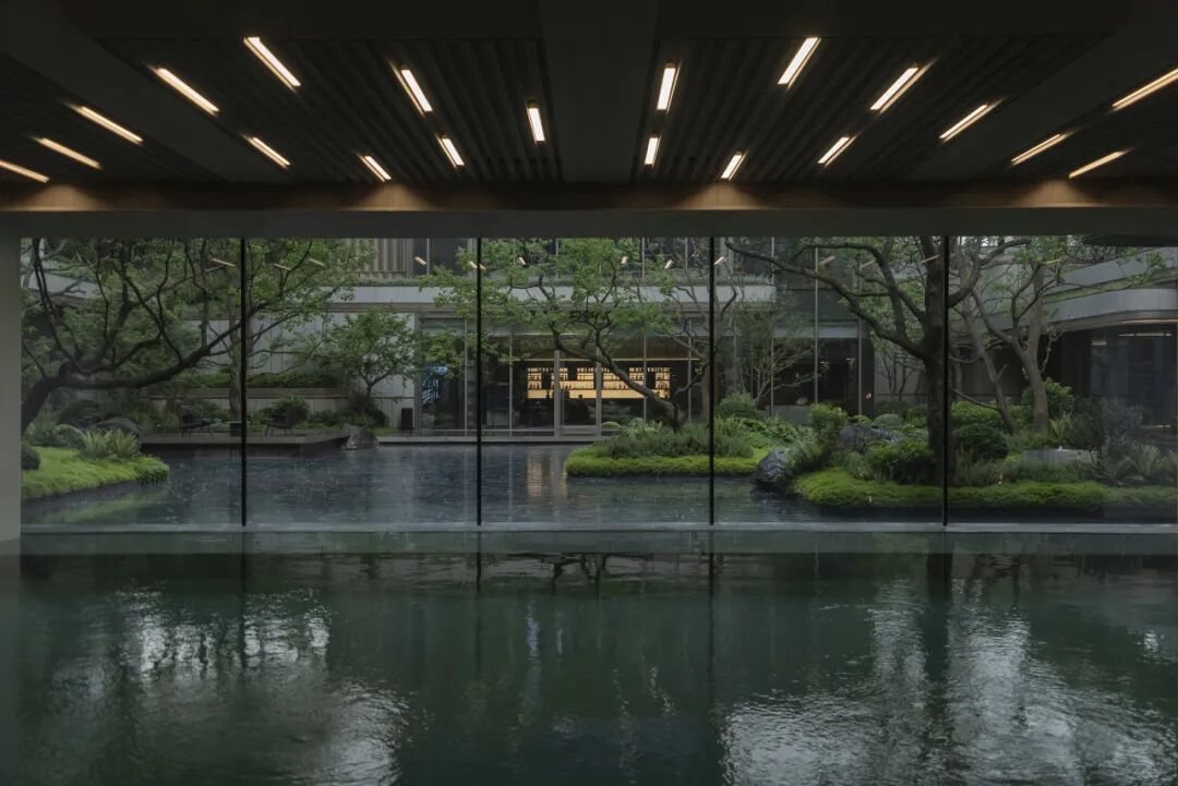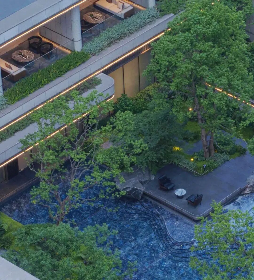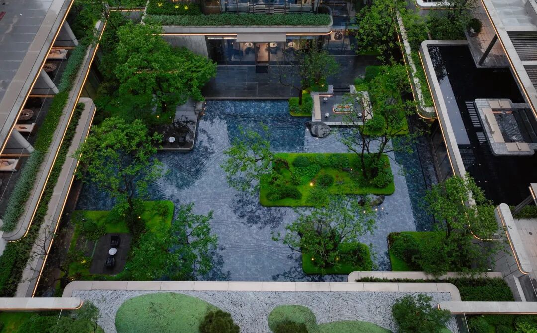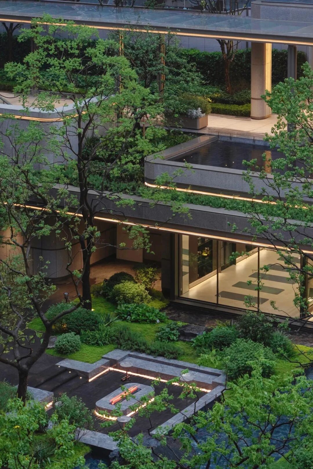 四层立体景观,相互交叠。第一层景观延展独树一帜,打破市面上两层通高的习惯性做法,达到“识绿不识水”的观赏效果;第二层景观叠加绿量,增加绿化层次;第三层景观绿树成荫,增加水庭户外体验;第四层水中绿岛,与水景相映成趣。