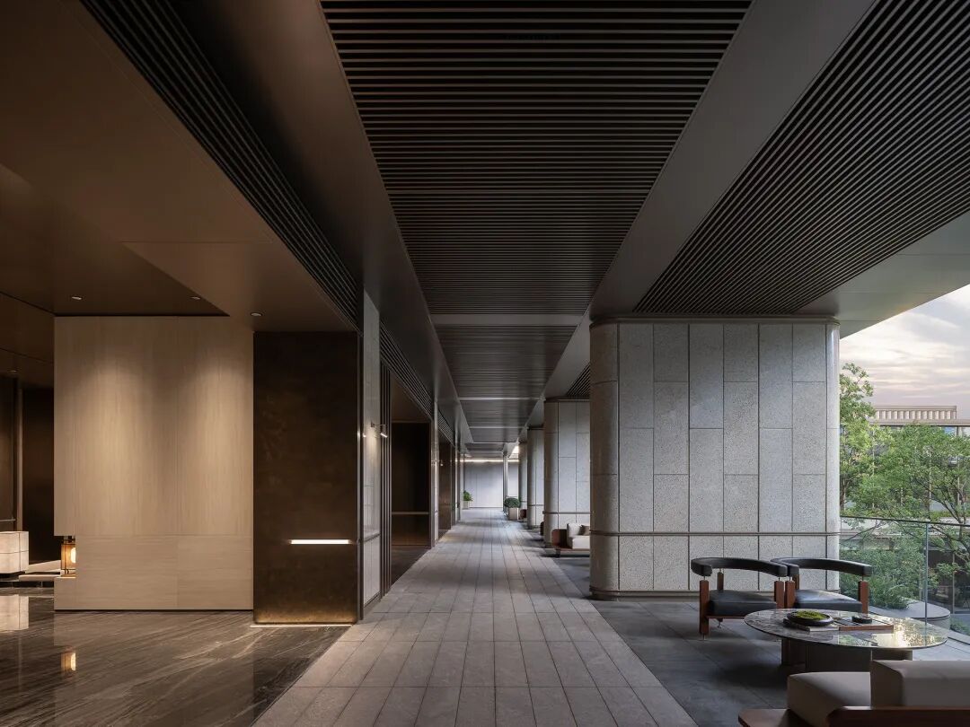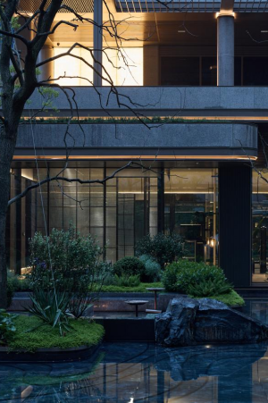 温州润府多维度考量,从室内对景、室外观景、闲逛移景、内外互景、立体叠景五个维度出发,功能上室内外延伸互补,视线上独立对景成画,360度无死角景观,打造丰富的下沉庭院体验。