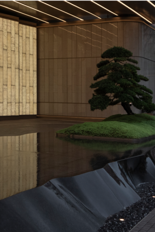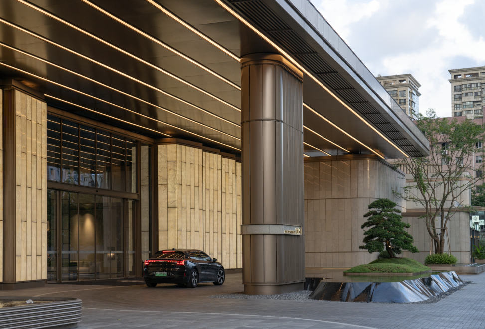 温州润府立足“永嘉山水,城市画屏”的美学意境,采用“东意西境”的设计法则,外立面采用低饱和度金色线条、暖灰石材勾勒永嘉山水的山峦态势,展现出奇峰异岩、雄奇险秀的永嘉山水画卷。景观以永嘉山水最具代表性的山、水、岩、瀑为灵感,开启人与山水自然和谐共融的寻景之旅。室内提取老城、瓯窑和山水元素融入到室内风格中,串联起老城记忆和新生活场景。