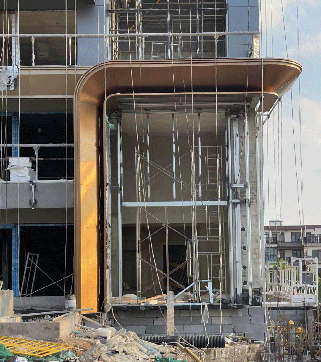 在材料选择上,我们大量使用玻璃和金属铝板,以浮动弯曲的香槟金铝型材和灰色玻璃间的动态距离创造出鲜明而极富流动感的动态曲线,呈现出既稳重又灵动的建筑形态,独创白云山新贵风姿。