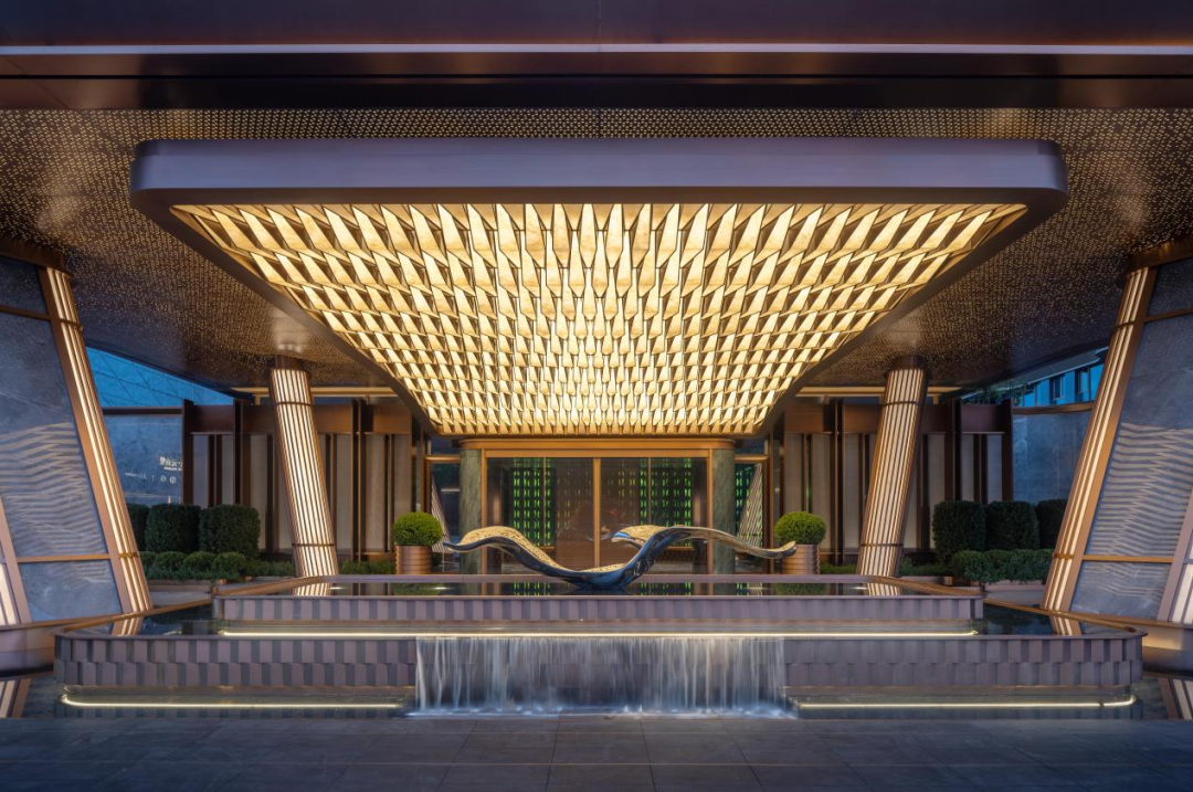 门廊顶棚满铺星空天幕,穿孔铝板通过参数化表皮设计,呈现中间密两边疏的灯光渐变效果。中央悬挂9*12米巨型龙鳞灯毯,由365块定制模块组成,作为廊下的主照明。