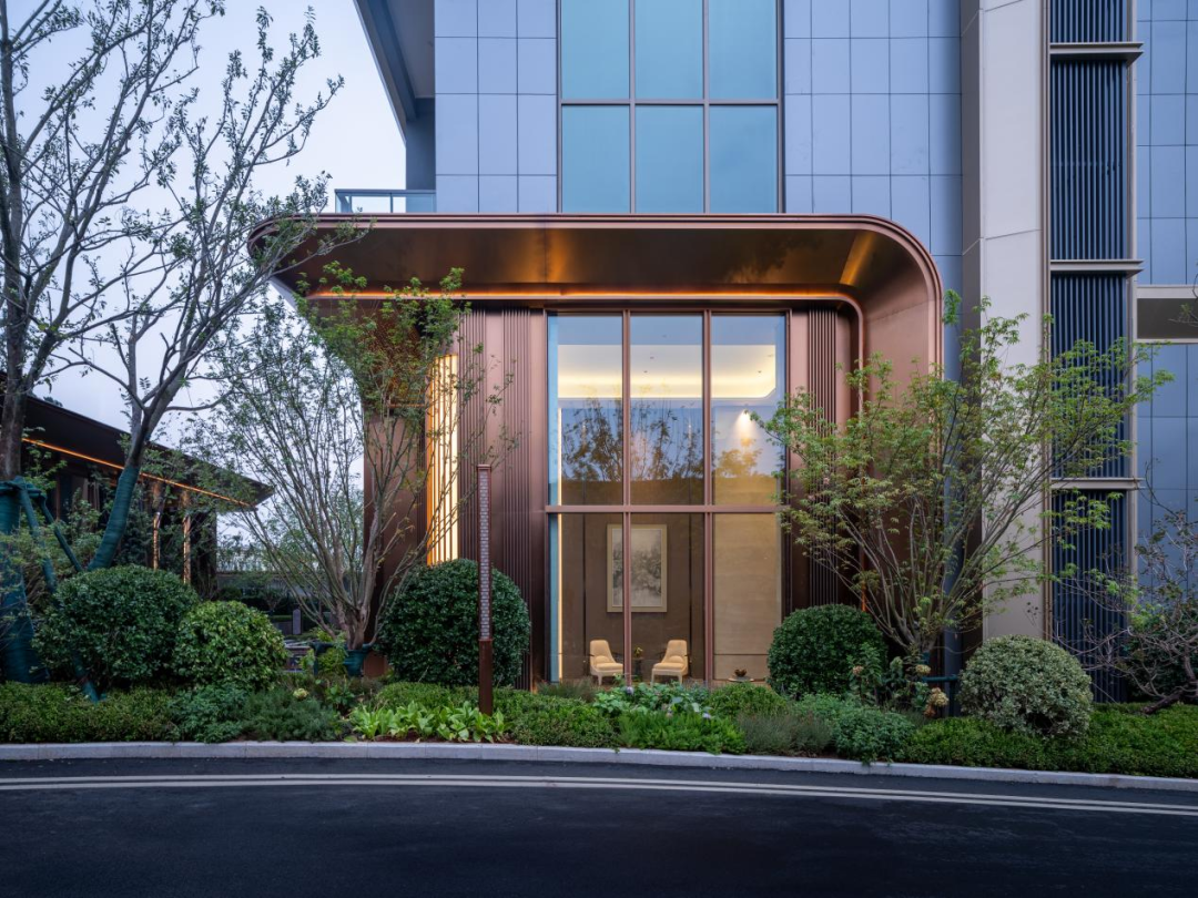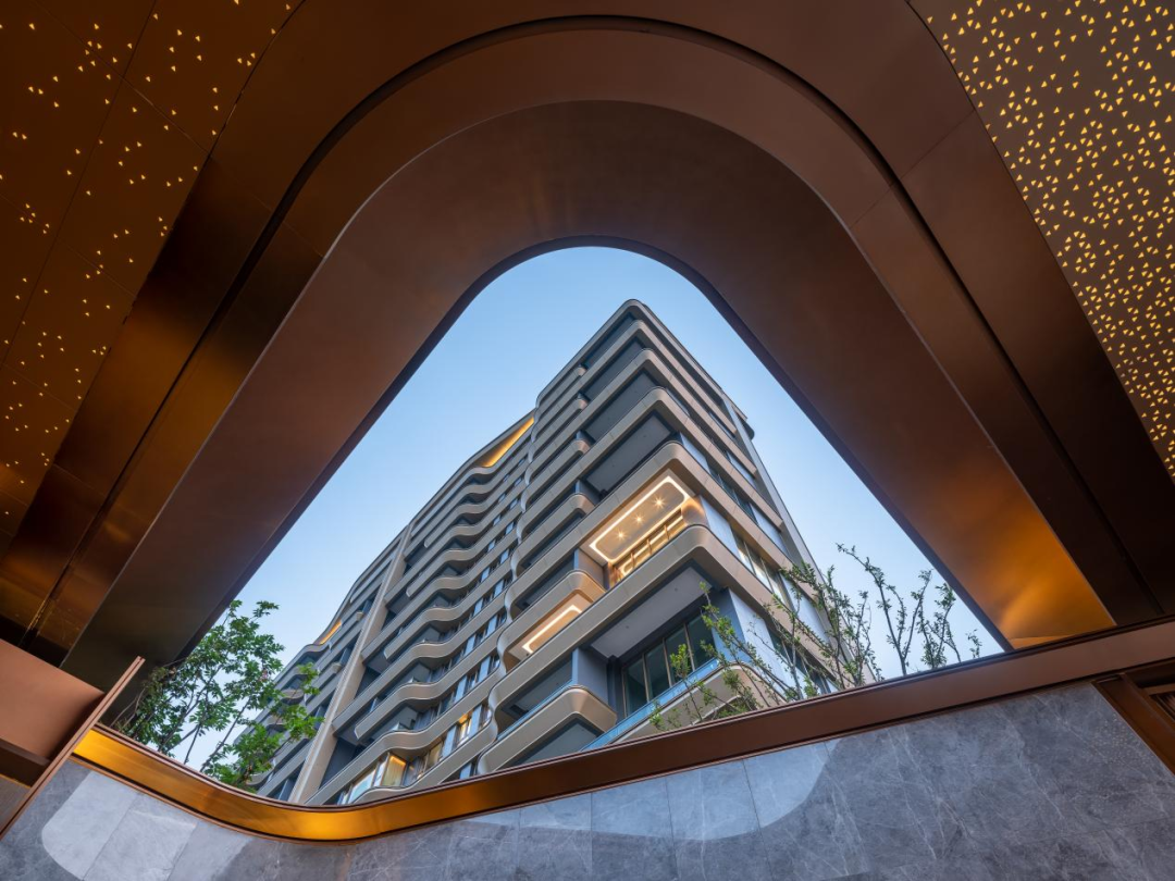 延展约77.77米的超大跨度艺术门廊,由4根巨型钢柱支撑,两侧悬挑近18米,在这里,开放、共享与封闭、私密被重新定义,创造出一个既能满足居者隐私诉求,又能融入城市脉络、自然肌理的多功能空间。