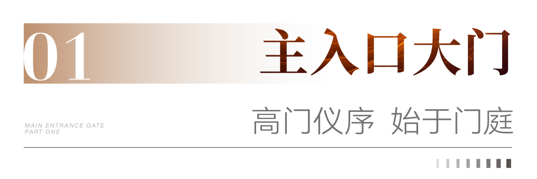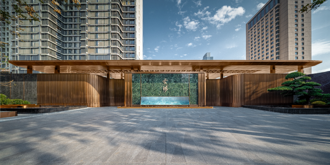 大门采用流水景墙造型,呈现出隐隐流光的玉石质地。 宽广的超级界面、隐奢的气质,通过高墙深院的围合,丰富的精致细节表达出来;仿古铜不锈钢与温德姆灰大理石碰撞出的深沉质感,传递出项目的厚重与典雅,普拉达绿大理石与天青色琉璃的结合彰显产品的隐贵与奢华。