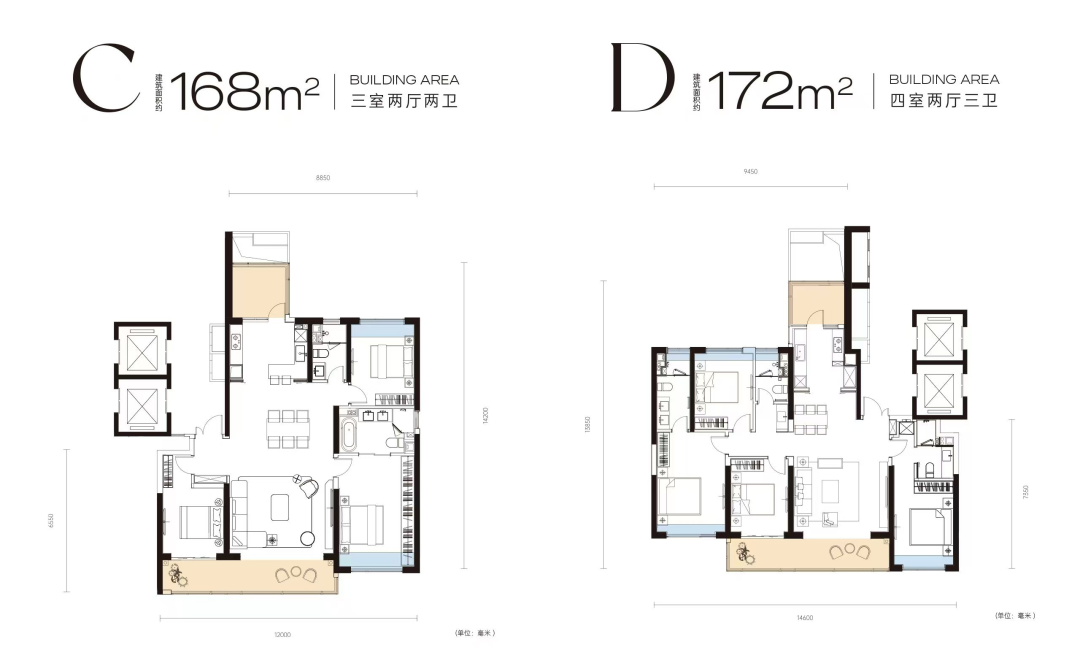 - 主力户型:高层 平层 144-180㎡ 4室 2厅 3卫