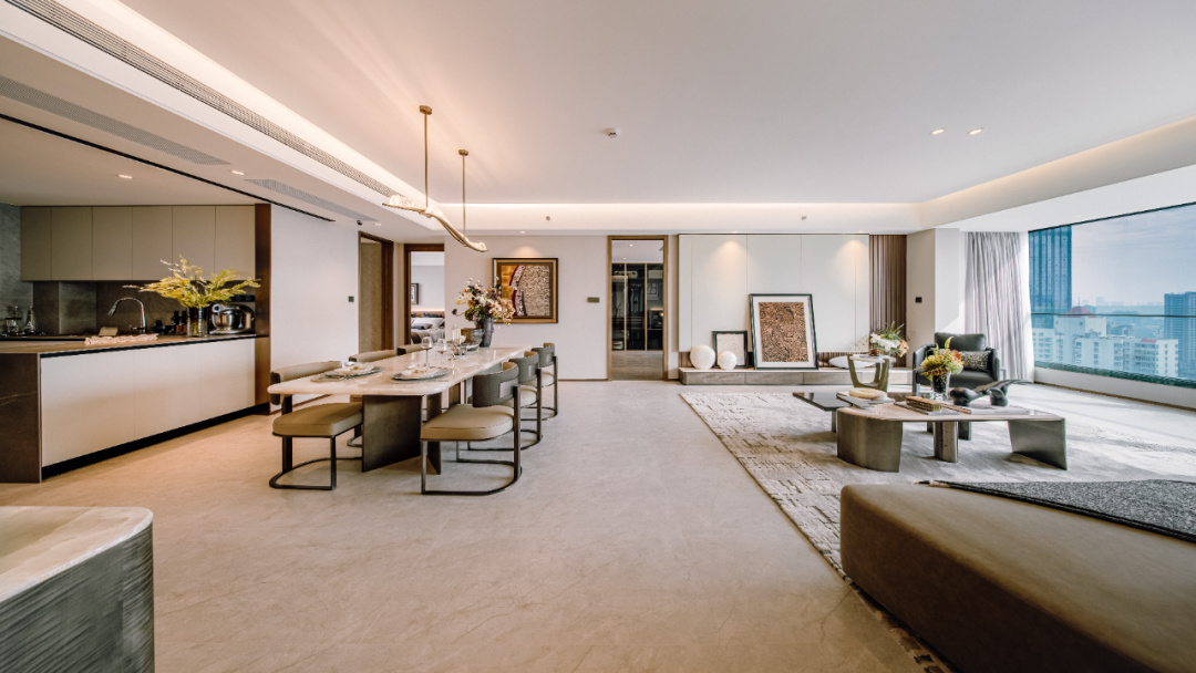 随着「盛璟」示范区开放,项目约168-172㎡的巨幕全景奢宅2号楼新品应势而来。 ◎项目168㎡户型样板房实景图 高区样板房以墅级南向大面宽,格局通透,阳光与清风皆邀入室,户内流动四时景致。