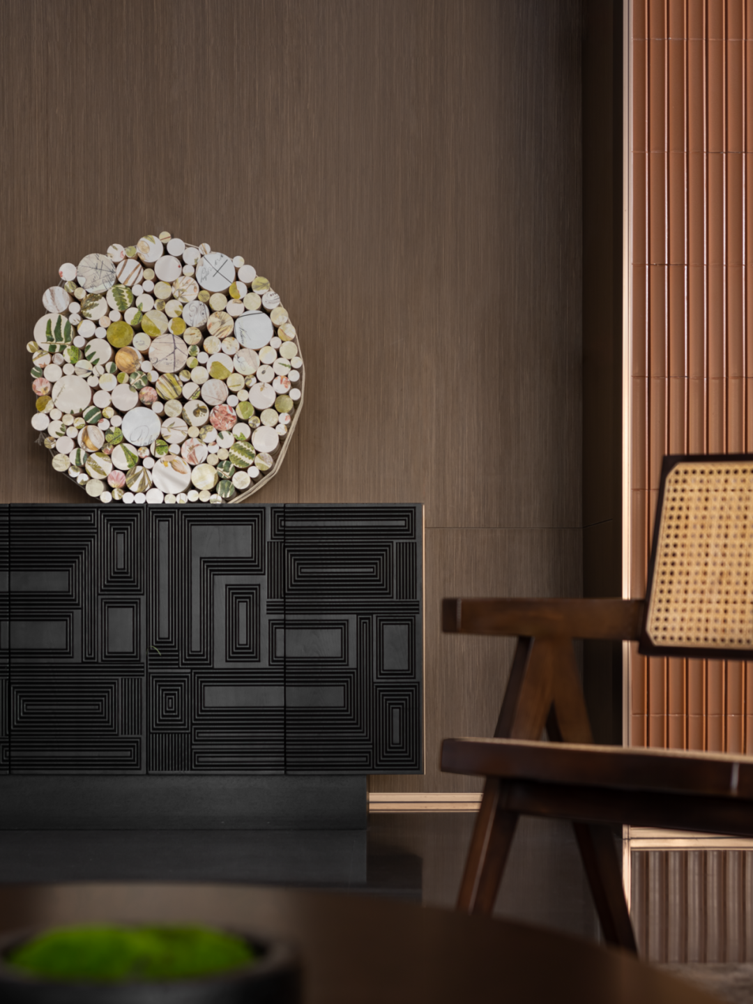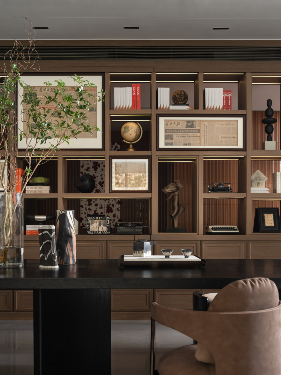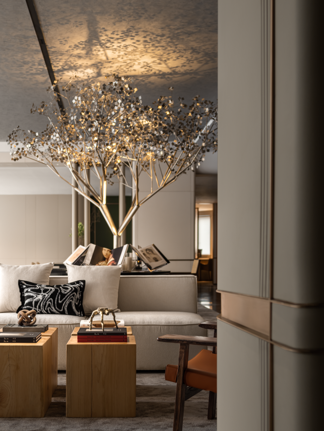 中式造景元素如屏风、造景和光影的运用,为空间增添了一份宁静与雅致。精心布置的景观小品,营造出如诗如画的意境。光影的巧妙运用,更是让整个空间充满了灵动之感。
