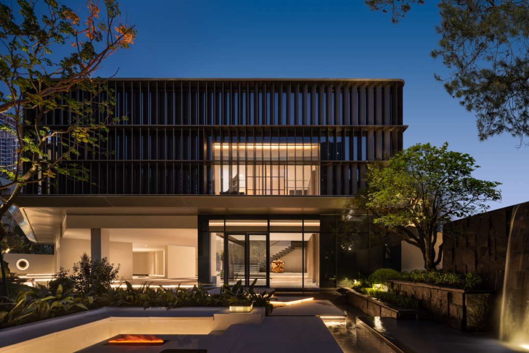 车库出入口的设计风格将现代雅致完美展现。坡道顶部定制了金属格栅天花,勾勒出波浪般丰富的艺术感、层次感;车库入口前区引入自然采光,搭配顶面立面棱角分明的金属折面造型。