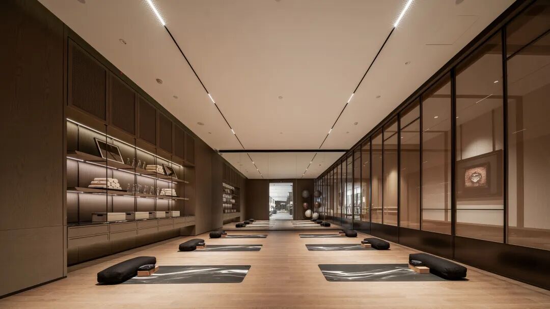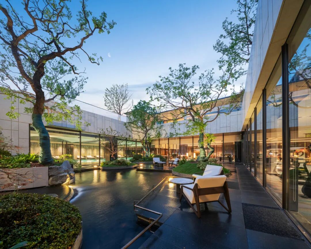 运动会所围绕飞瀑布局,包含了南部新城唯一恒温双泳池、健身房、瑜伽房等空间。静态会所环伺在禅月庭院周边,包含行政酒廊、红酒雪茄吧、私宴厅、茶室等空间。
