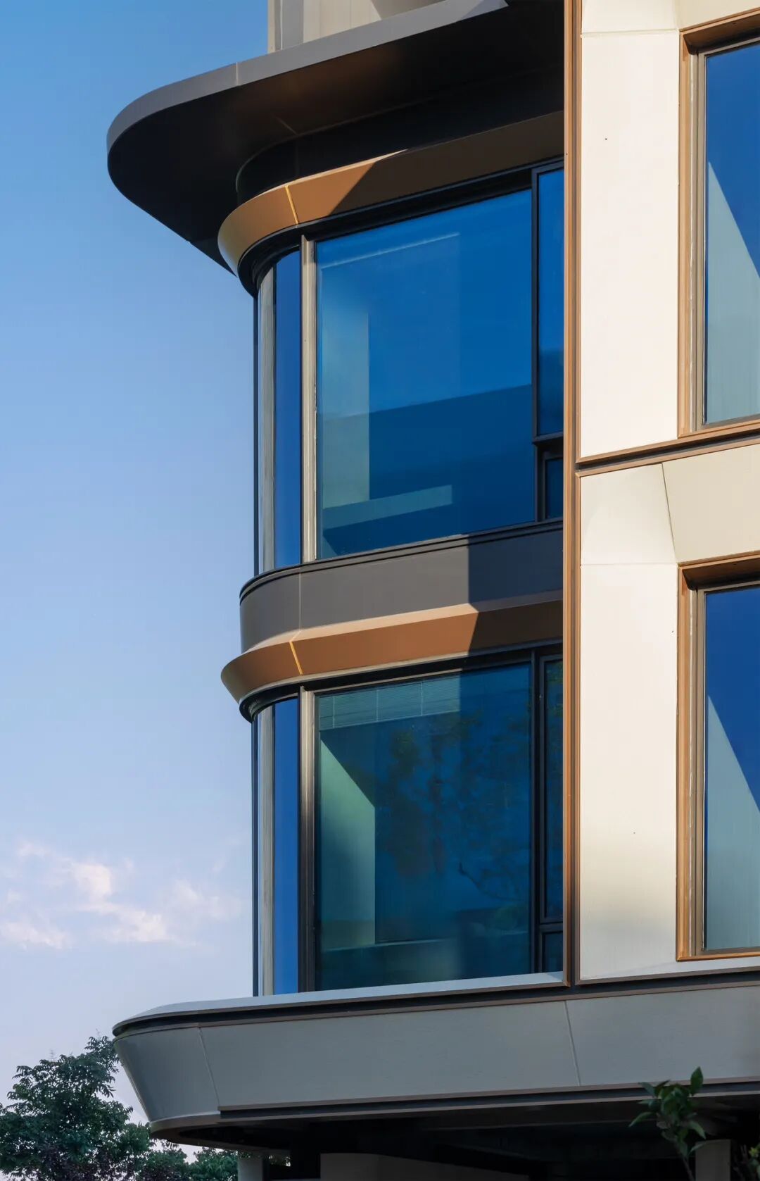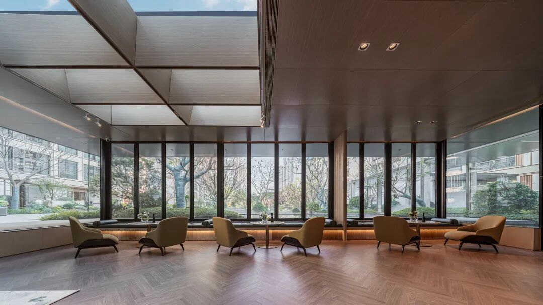 值得一提的是,中信泰富·九庐还首次将色温的概念,引入到建筑立面之中。配以3000k(冷色到暖色的过渡颜色)色温铝板,在阳光下熠熠闪耀,显得美观大气,辨识度极高。