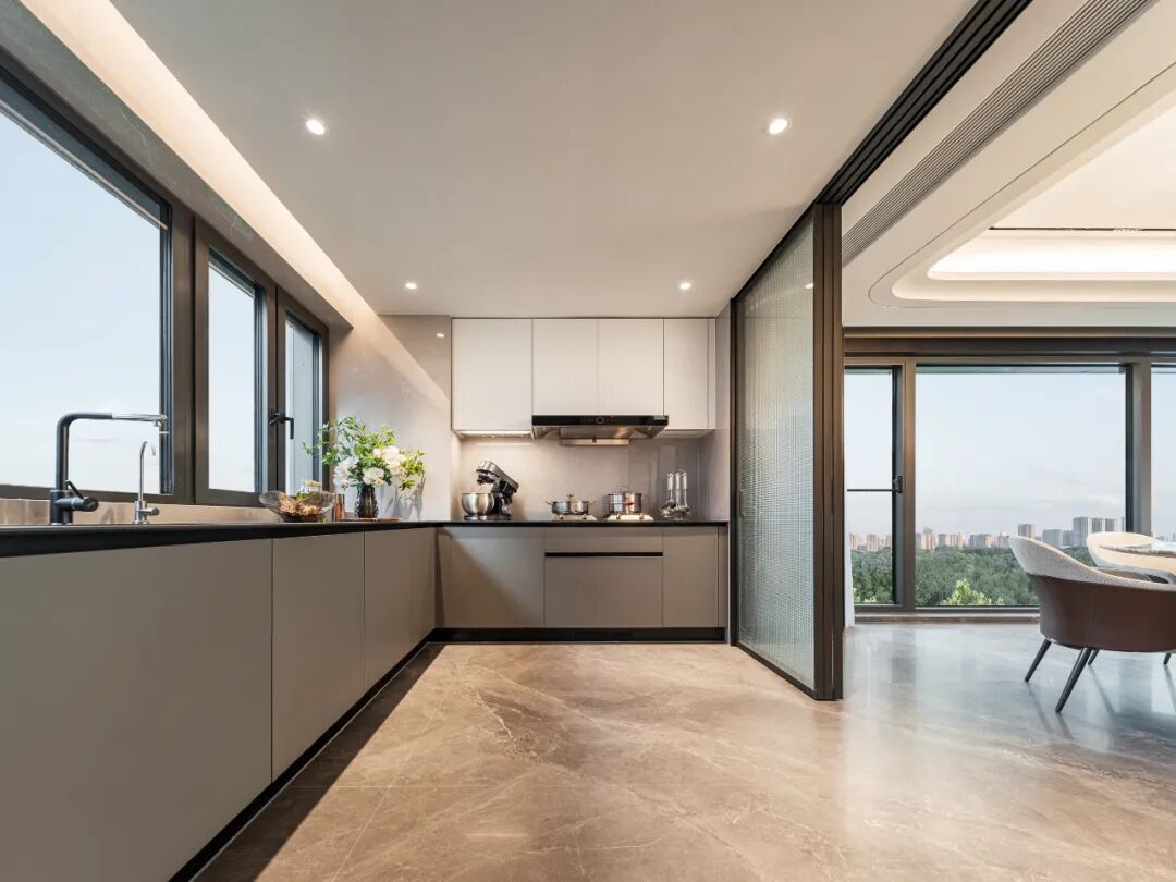 建面约230㎡洋房样板间厨房、卫生间和卧室均采用世界顶尖品牌的旭格系统窗(除南北阳台拉⻔和阳台封窗外,全屋都是旭格门窗设计),耐腐蚀、气密性、隔热性、保温性及隔音性效果均非常好。主卫的龙头、花洒采用纯进口的德国当代,所有的台盆和马桶都是劳芬的,给足业主高奢体验。