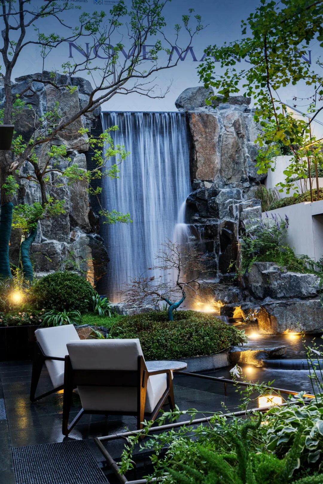 漫步园内,移步异景,横向约160m景观中轴,将无界之门、四季庭院、琉璃水院、艺术光庭、石韵流瀑、镜水浮桥、九庐书屋等七境串联,宛如“住在公园里”,美如图画。更惊艳的是,九庐还打造了“三重叠水”,高差约6米瀑布,飞流而下,两侧是近200吨山西黑天然石材,瀑布上游设计一片约500㎡的镜面水景,气势磅礴,赏心悦目。