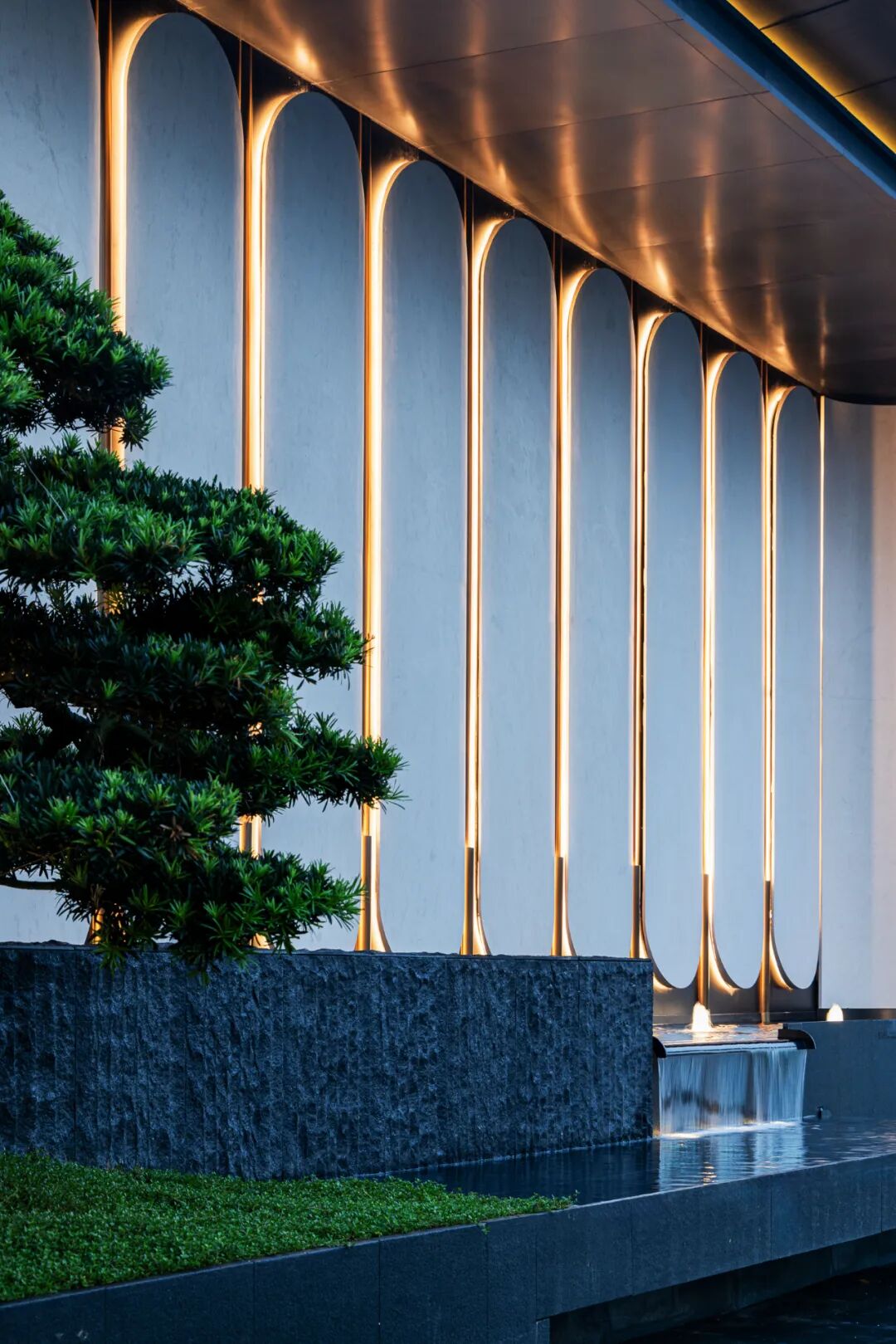 约52米宽的“玉羽华门”,是南部新城最长的一扇大门,使用上百吨的保加利亚维纳多石材,结合双曲面工艺+叠水涌泉,融入帝王“五明扇”元素,将高门大院、大宅风范展现的淋漓尽致。7级黑金沙整石台阶+价值百万的榔榆、罗汉松+大门中央的巨幅潘多拉奢石照壁等元素融为一体,随手一拍,便有大片既视感。