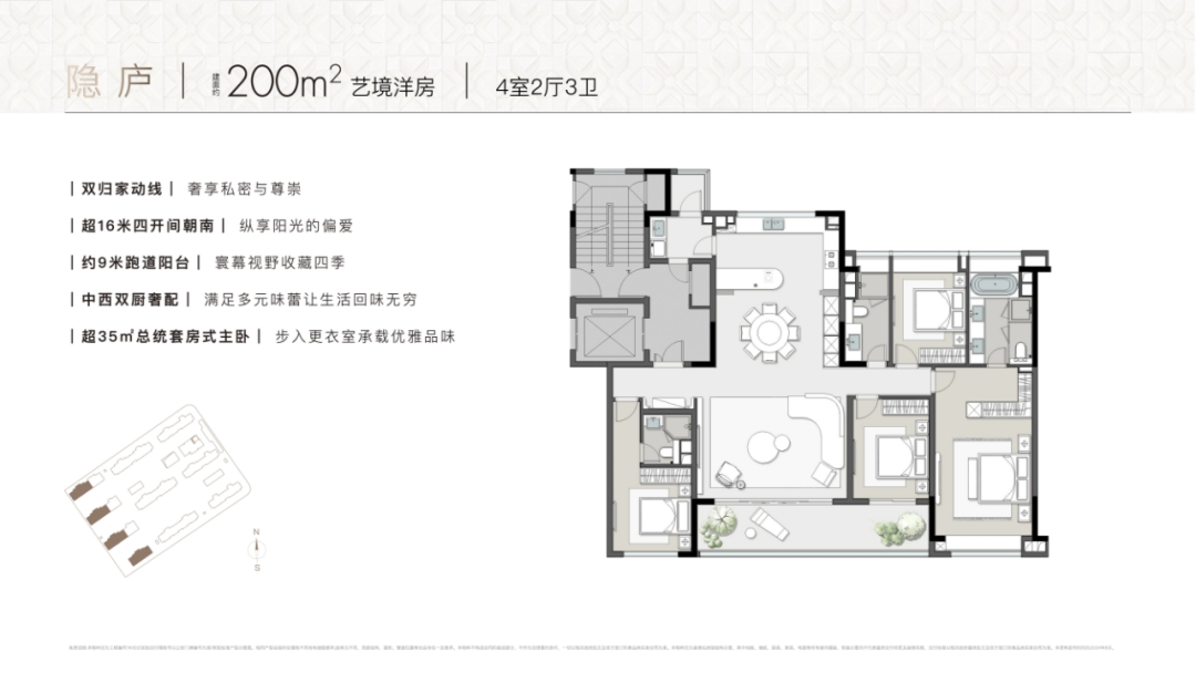 南向双间套房设计,一步到位满足改善的置业需求。其中,约30㎡的行政套房主卧,带独立的卫生间和衣帽间,堪比奢品酒店。建面约200㎡洋房户型,四开间朝南,南向开间达到16米,再加上2米进深的阔景跑道阳台,采光一绝,让居住的品质感拉满!