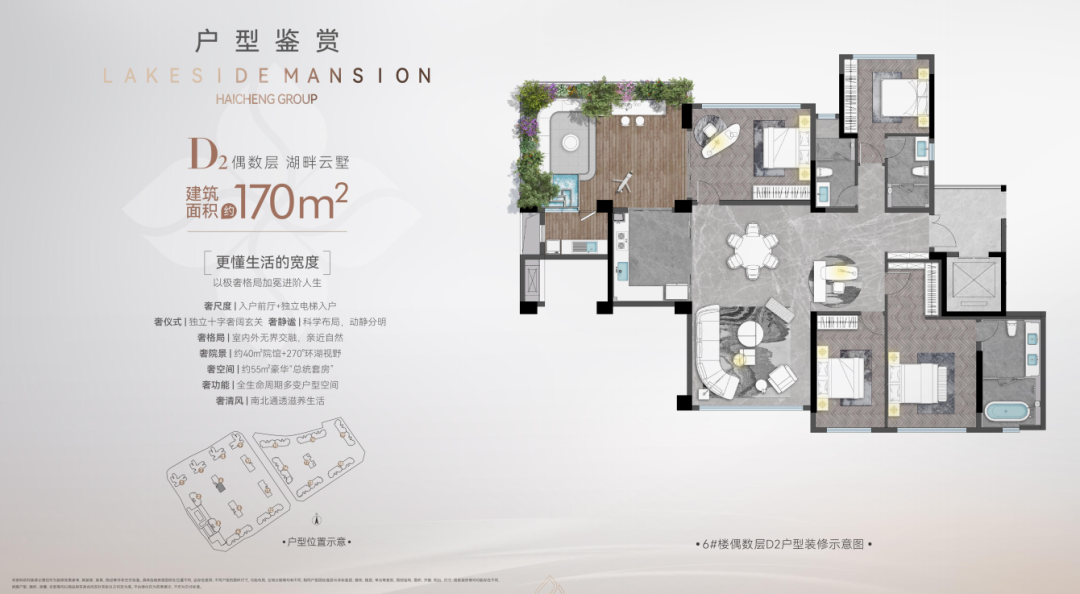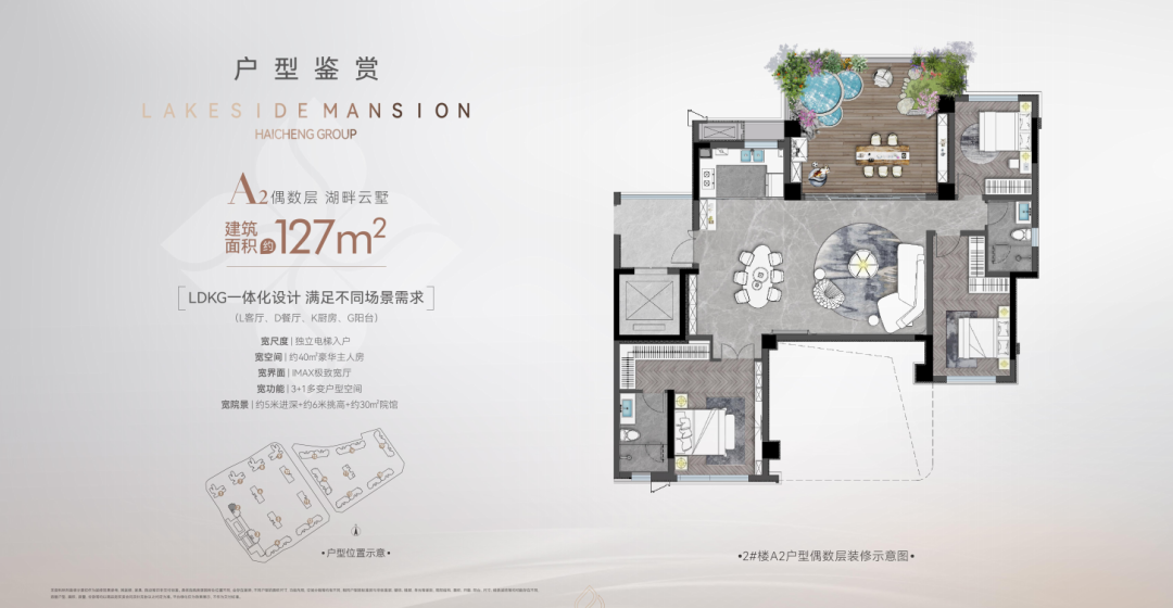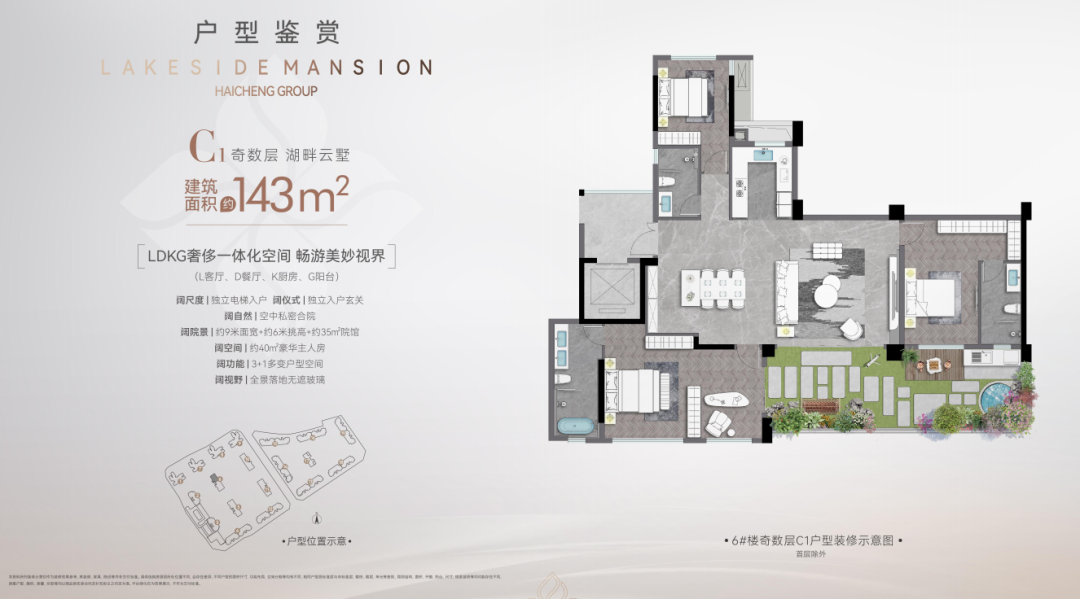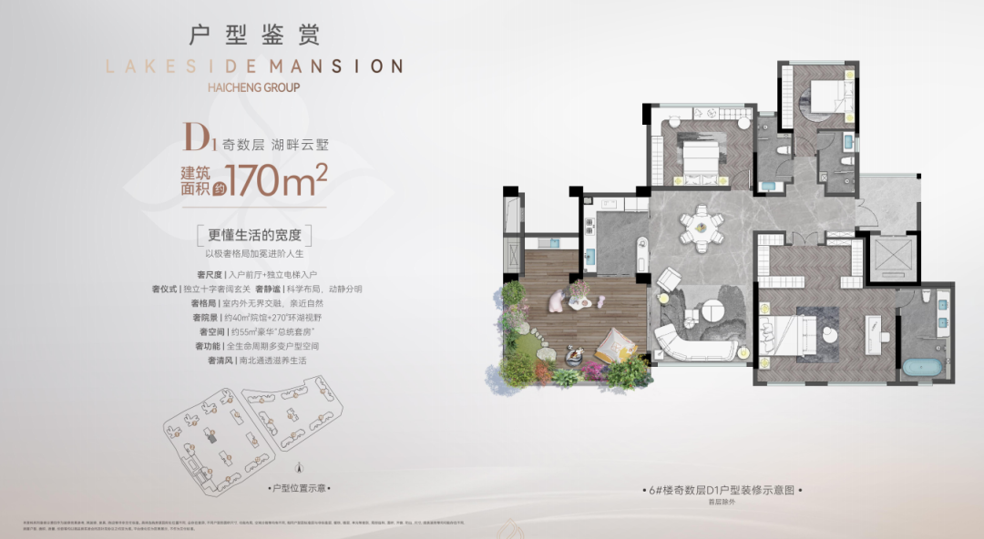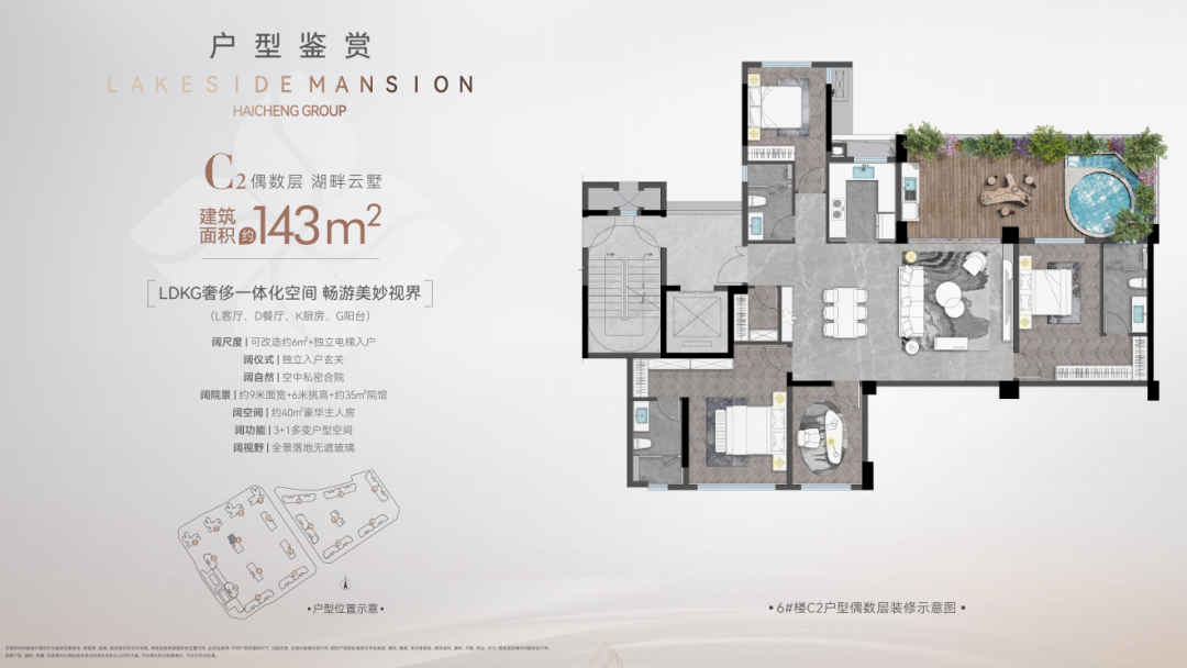 海成云湖郡设计了一个约 6.3m 挑高、约 30-40㎡空中生态院馆,把院子搬到家中,给每户业主送来私享院落生活。加上环幕 270°极致视野,科学的交叉光线设计,通透性进一步加强,实现垂直森林生活,让你的情绪价值得到释放。