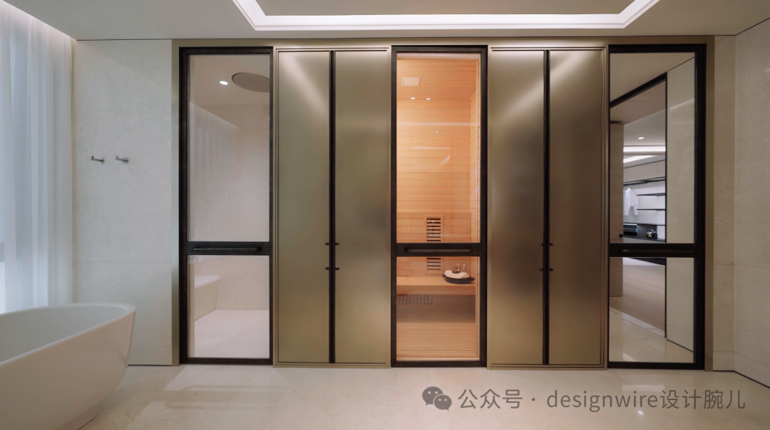 衣帽间|主衣柜选用Piero Lissoni+CRS设计Porro铰链式柜体,配备烟灰玻璃和深棕皮革板,与摩卡金立柱细节Boiserie储物柜组合,哑光背板则与集成照明融合。