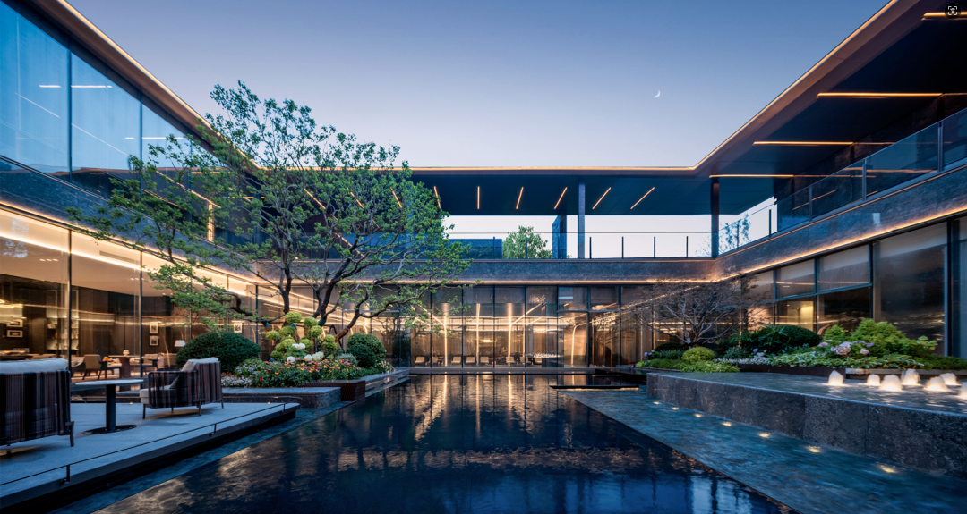纵向维度,是囊括山川河岳的下沉式中央庭院,约12米飞流星瀑如九天之水奔涌而来。你从室内,通过树的摇曳和水的流动,就能感受到阳光和微风。