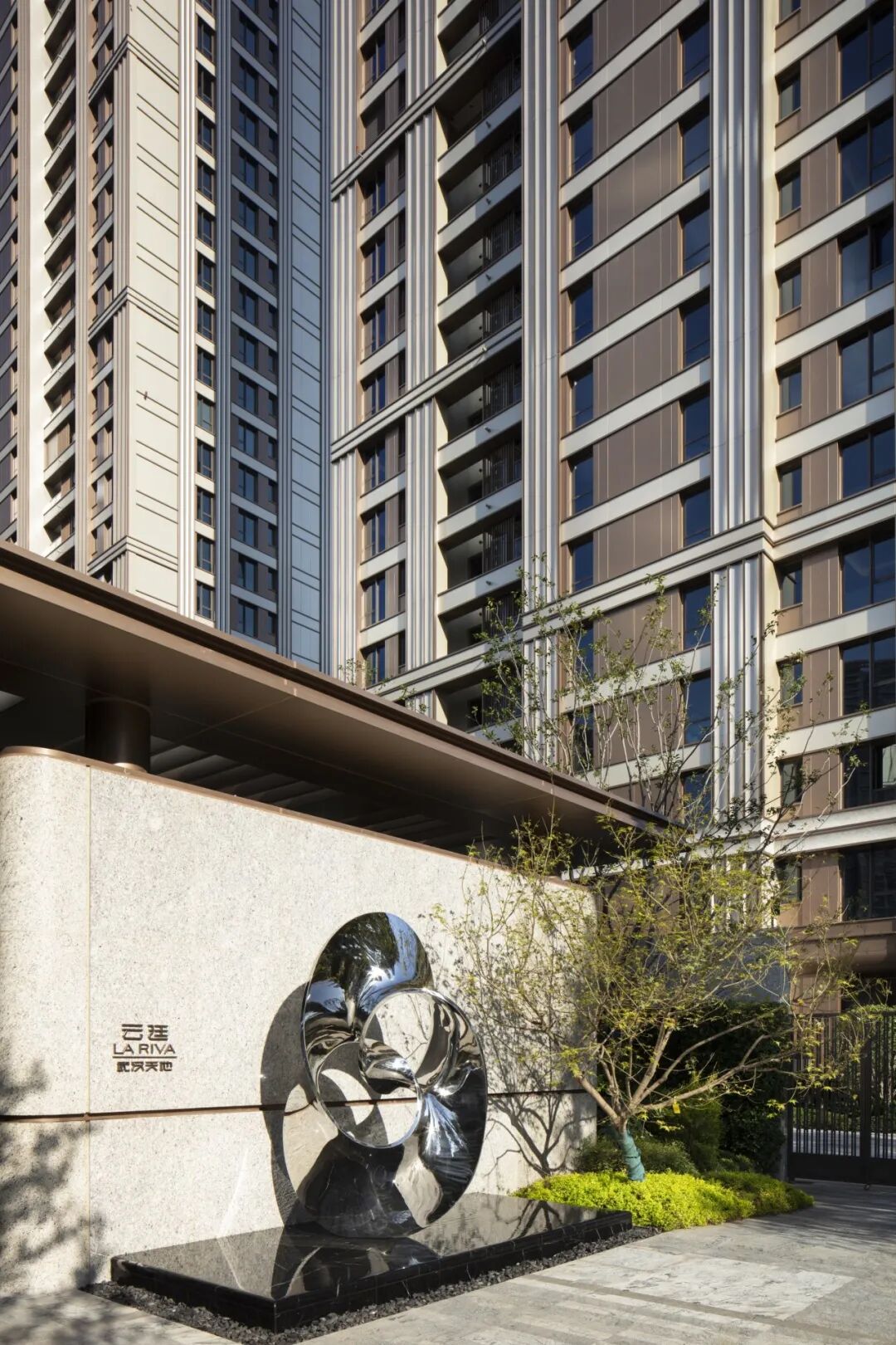 住宅立面延续天地内涵文化,置入水波涟漪的弧形元素,结合自然的有机生长,打造出尊贵的品质感。
