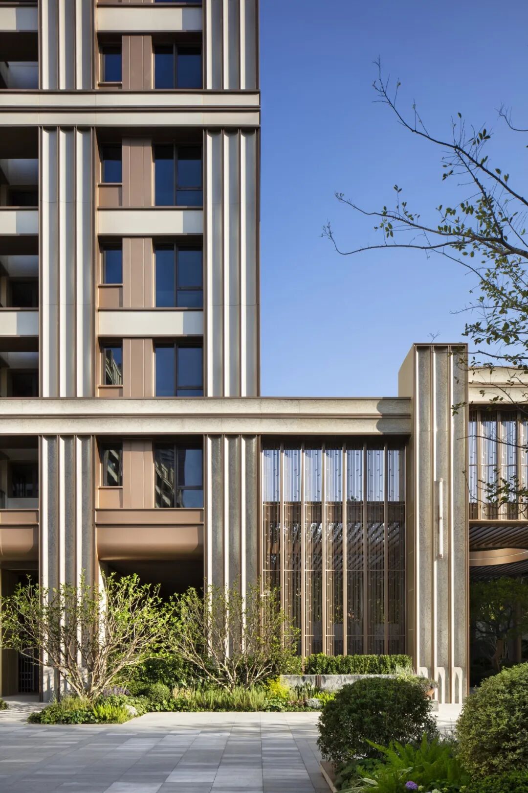 玻璃与铝板等现代材质,强调出竖向线条的美感与立面层次,古铜、深灰、深咖等古典主义建筑中的经典色调,赋予建筑高颜值与宁静雅正的气质。