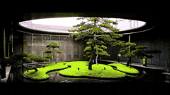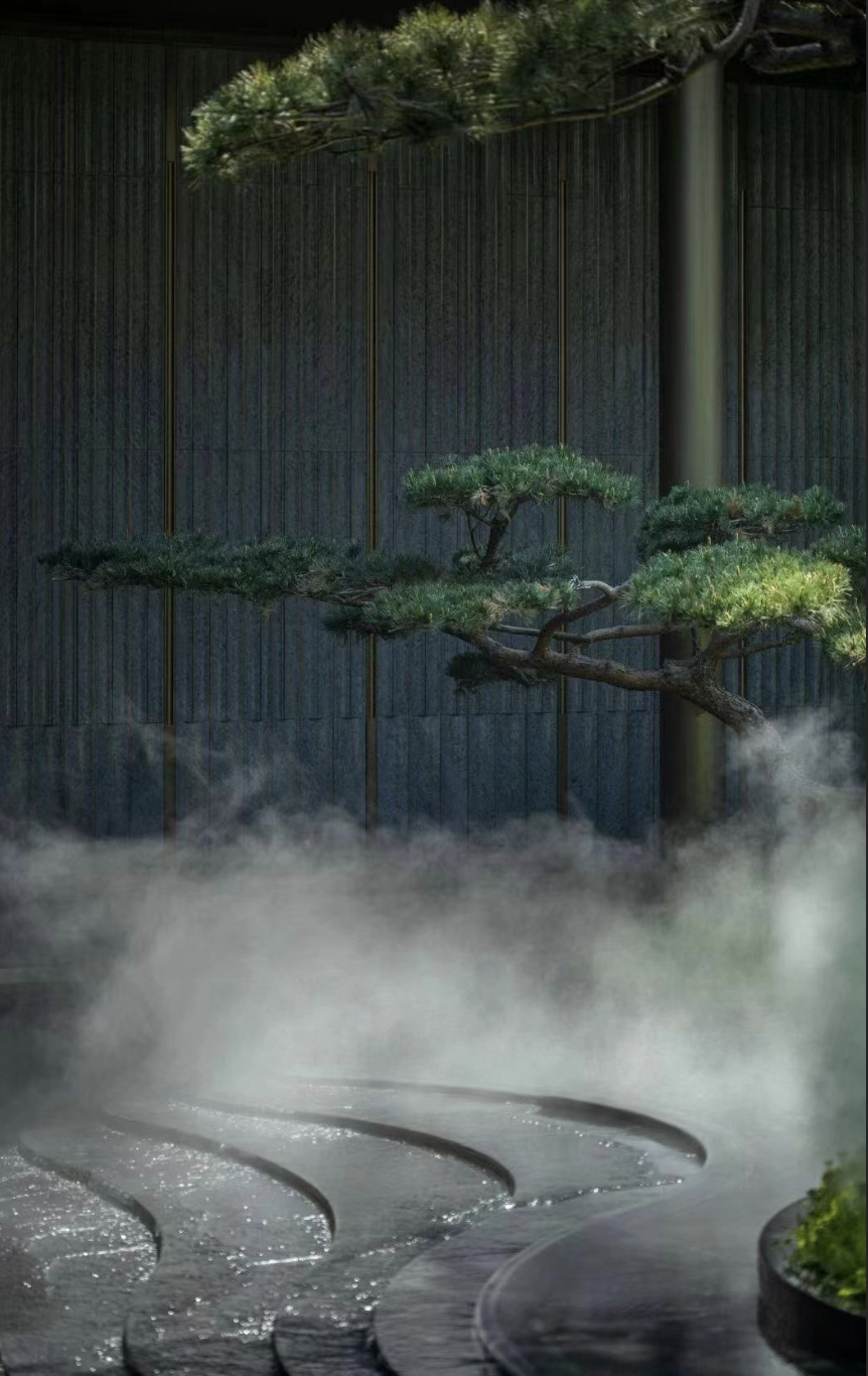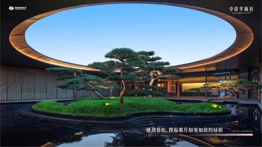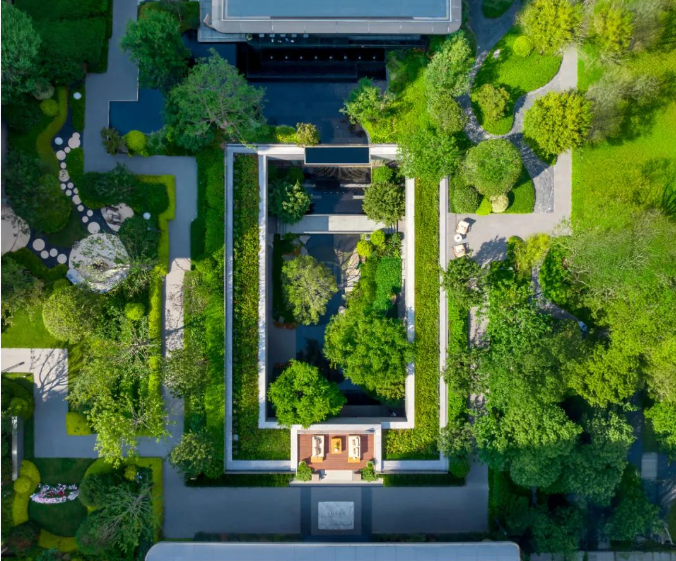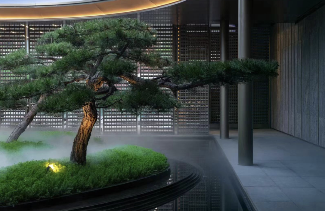 ◎ “天圆地方”的理念,把约 13.2 米内径的圆形顶棚与水池的设计相映成趣,形成了“天空之境”再栽植五棵古松,营造归家仪式: