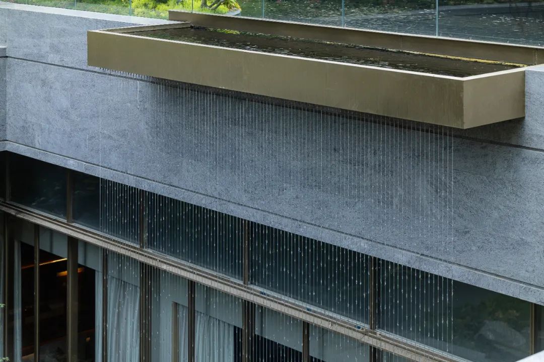 中庭水景由 9 大部分 219 种不同曲率半径的 623 块异形石材构成,连廊墙壁采用“凹”面印度蓝石材装饰,为保证对缝效果,采用1200mm 的分割宽度单元,同时经过反复试验每块石材凹面弧长保证在 80mm 左右,实现最好的光影变化。行走其间,瞬息四时风景,手碟如月,与灿然鎏光融合为一,感受能量流动、复关内在,让生活的叙谈自然而然发生于此。er