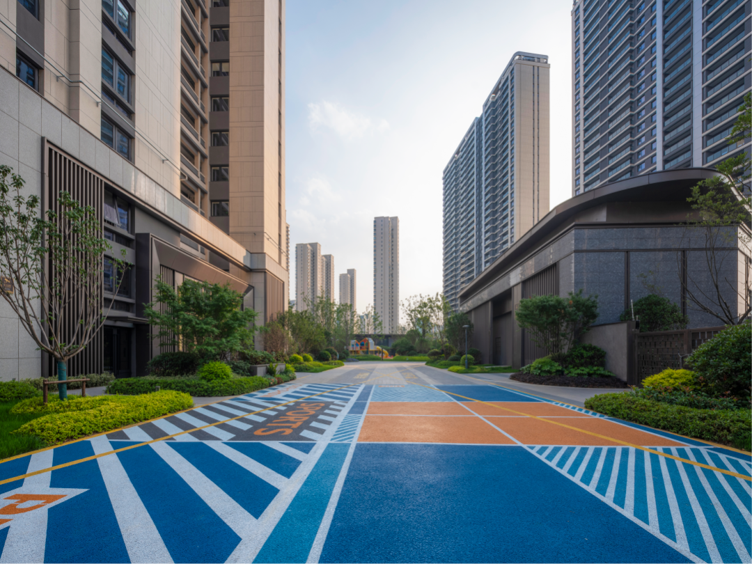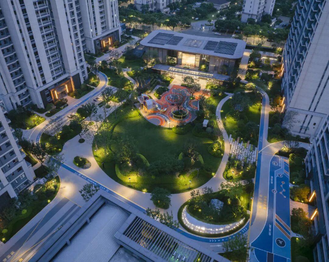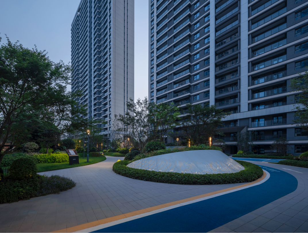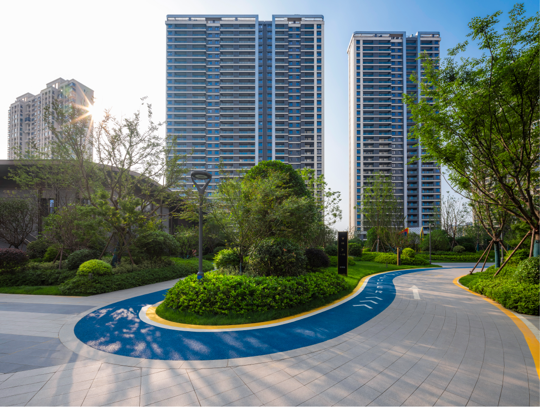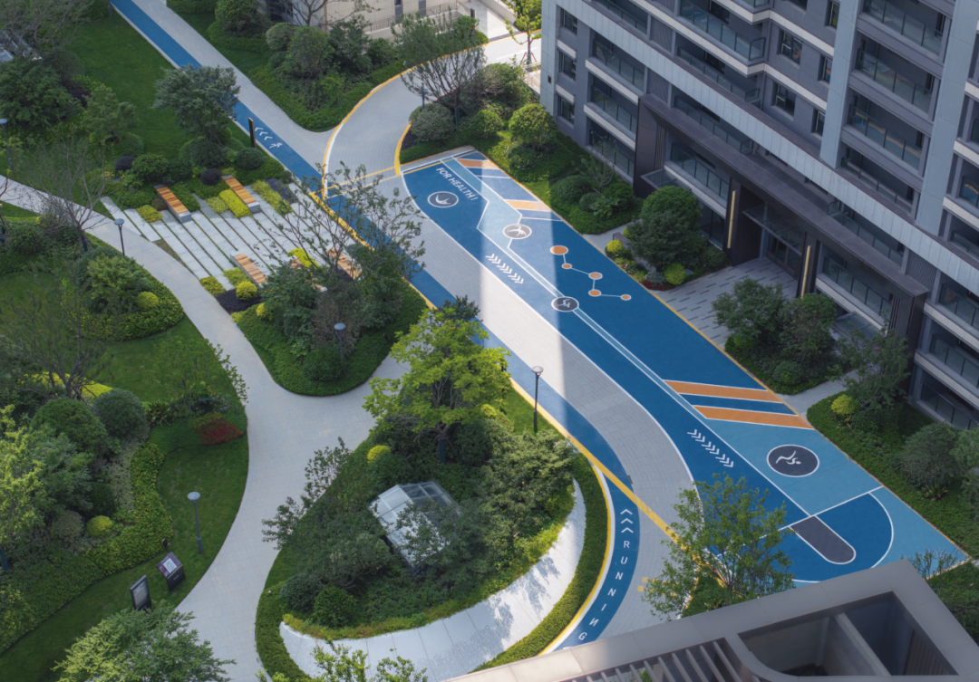 外圈的园区慢跑道,仿佛一条蓝色丝带巧妙围起了所有中心景观。傍晚慢跑在此,晚风带着树木泥土的芬芳,呼吸间,清新的空气涌入肺腑,在这份宁静与美好中,忘却时间的流逝。