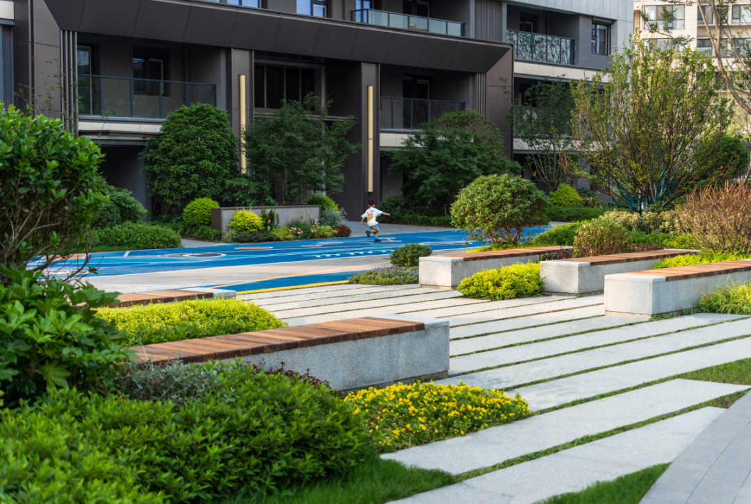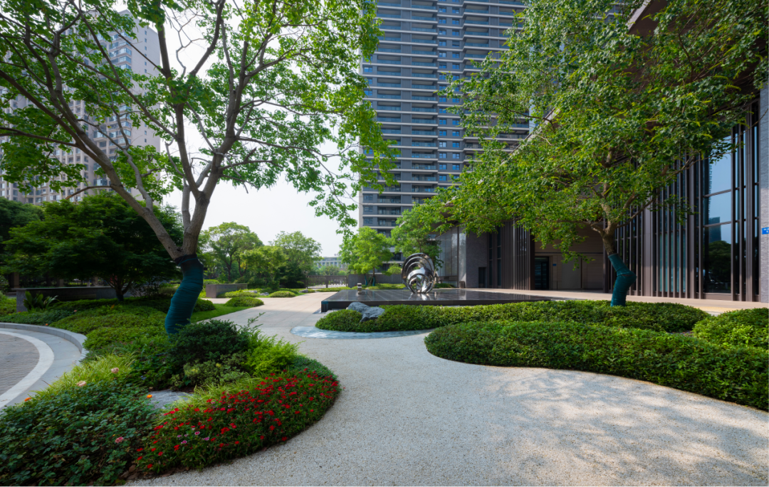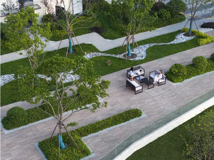 树下随处可见的坐凳给行人提供休息的场所,天光云影的交织下,将社交休闲更加灵动地叠加到森郁的空间中。与自然共呼吸,在现代中悦享精致,自然中疗愈放松。静看叶落花开,坐观流云似水,在这里,放下所有繁杂,独享生活的诗意。
