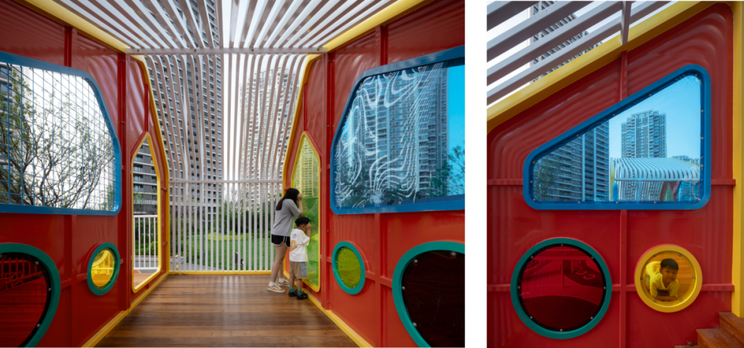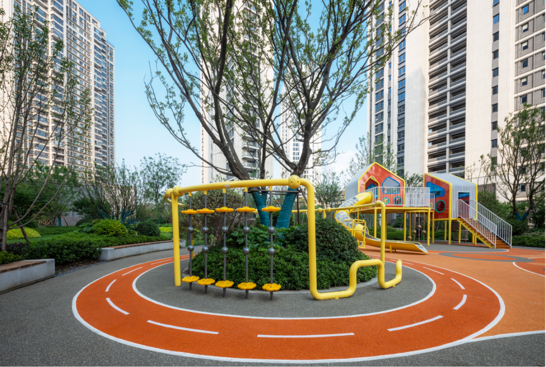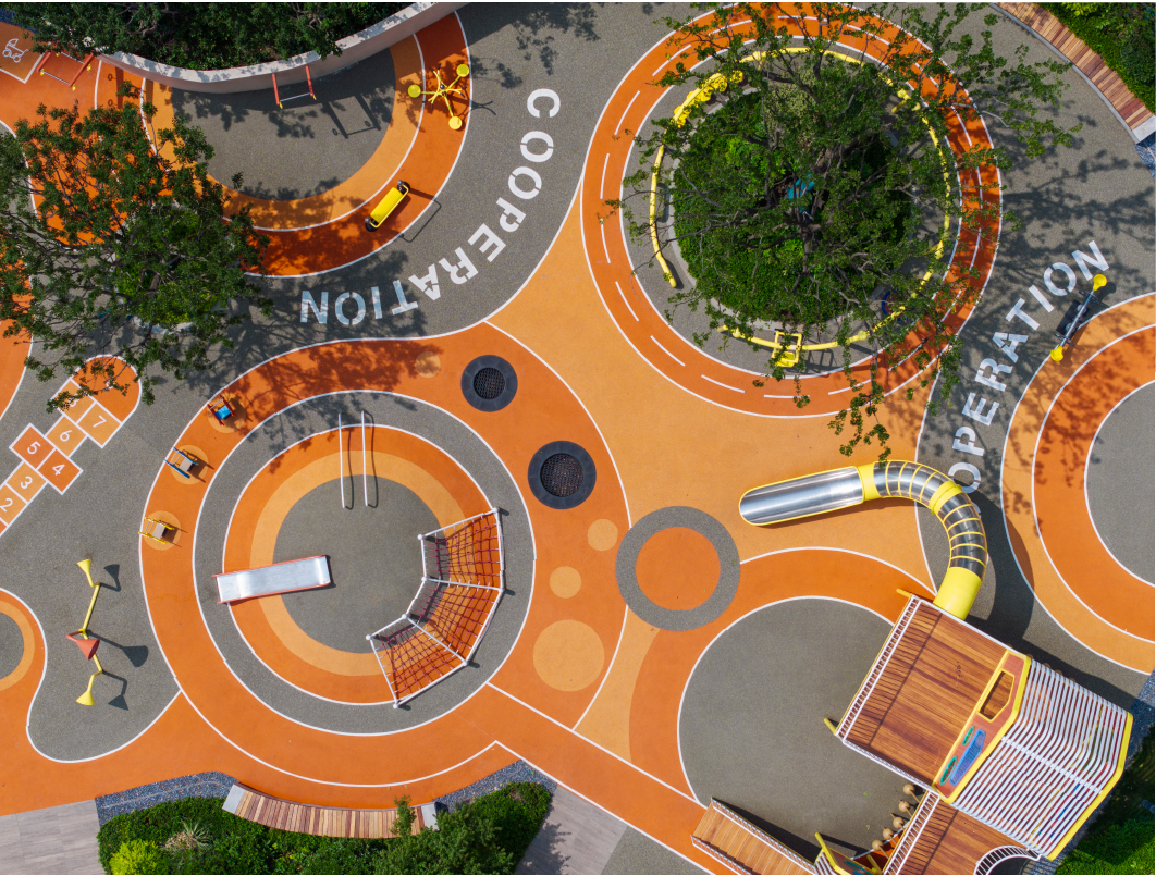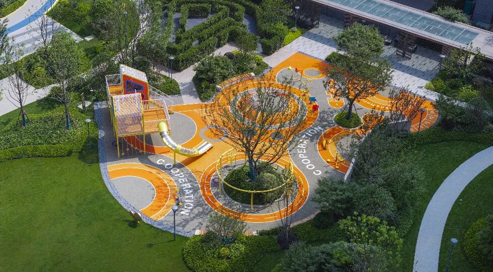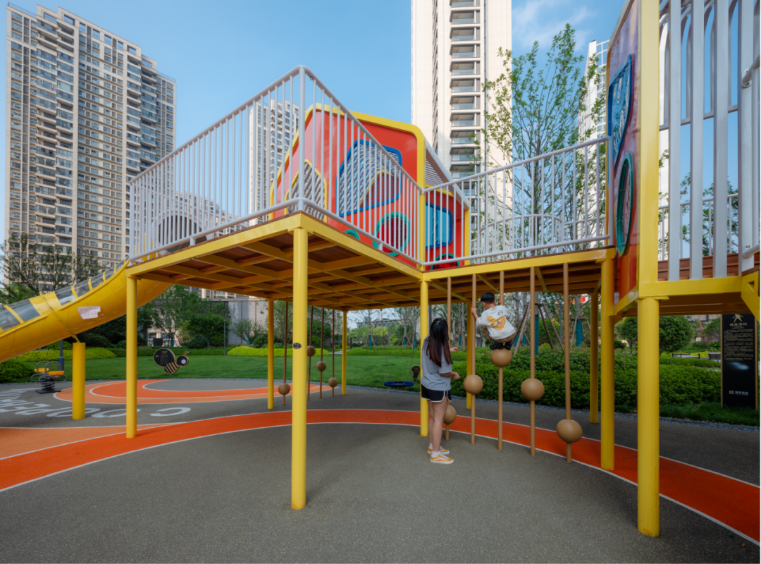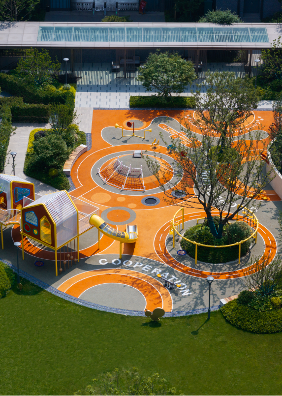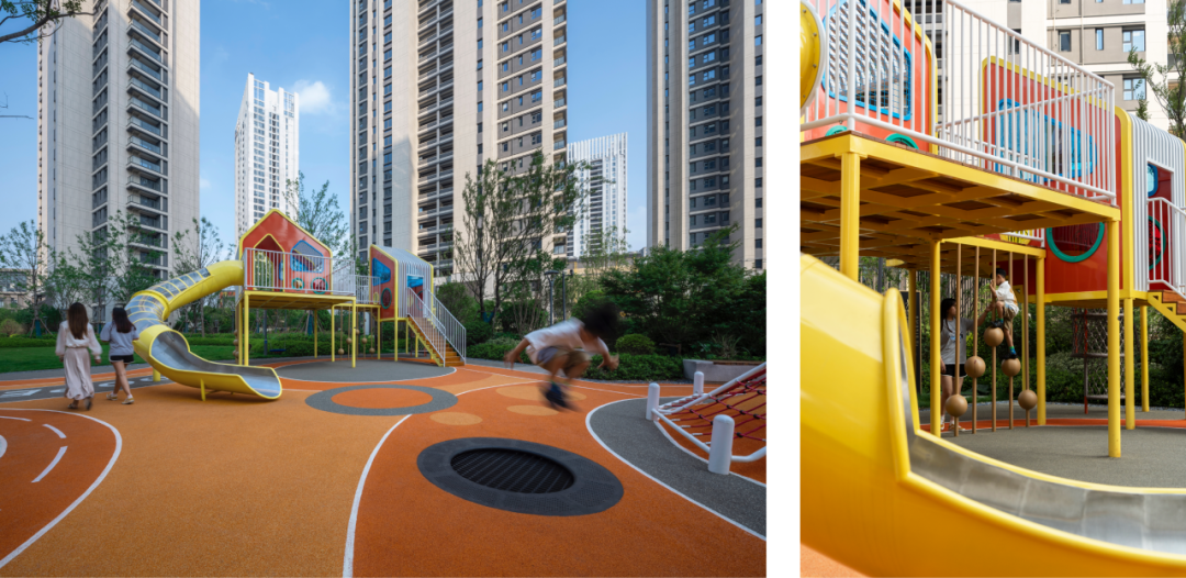 橙黄色的全龄儿童游戏区在整个场地中心区域显得格外出挑。这是一处丛林空间,延续了空间景观的森居理念,并被赋予“探索自然”的特性,让孩子们像小松鼠一样在“森林”进行奇妙探险,引领他们融入自然与艺术的奇妙世界。