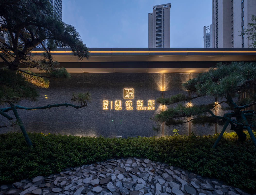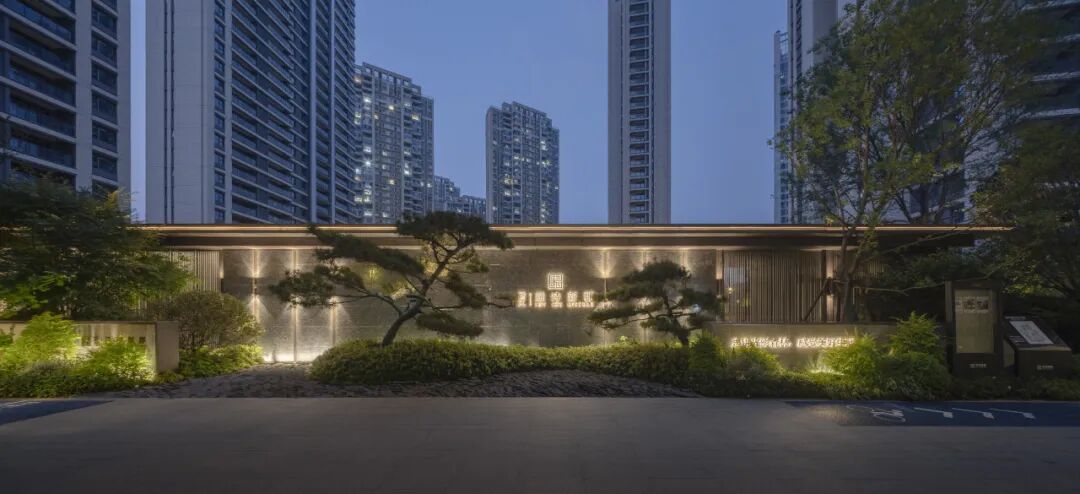 穿过售楼处,仿佛进入了一个深邃的空间,引入眼帘的是面对景的景墙,上面的logo与“朗诗新郡”几个字在灯光的映衬下醒目而又优雅。精心点植的两棵造型油松与景墙相得益彰,宛如两位迎宾员悄然引导着人们步入园内,探寻其中的奥秘。景墙的设计巧妙地遮挡住原本通透的廊架,把住户的生活空间与外界空间进行分离。