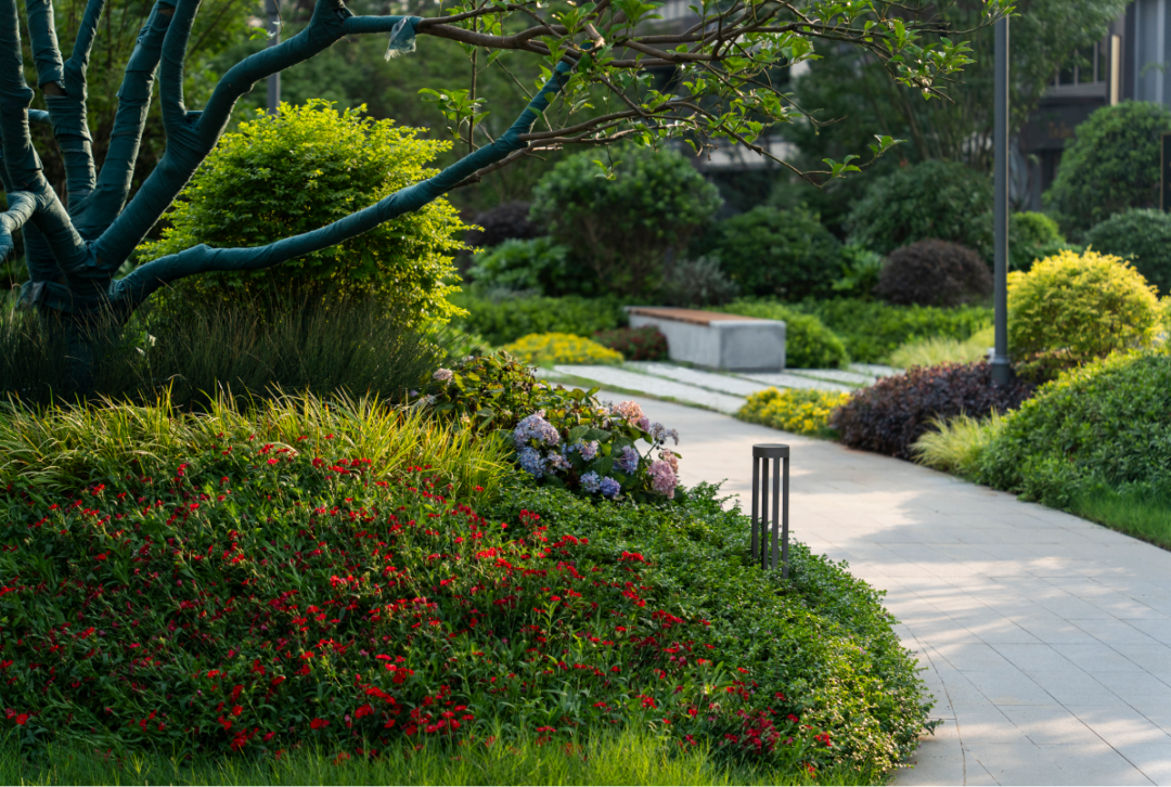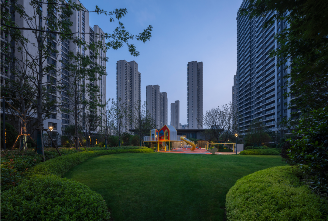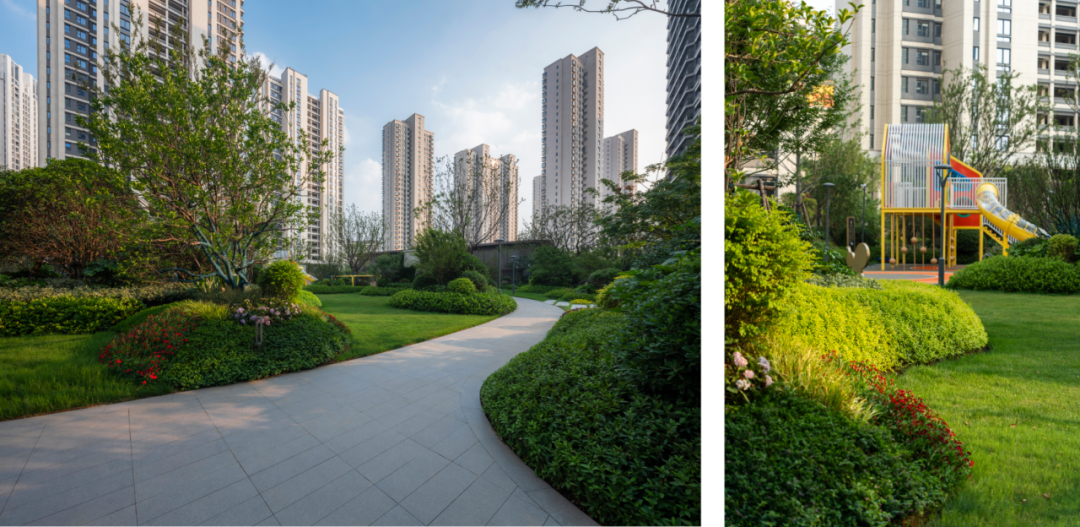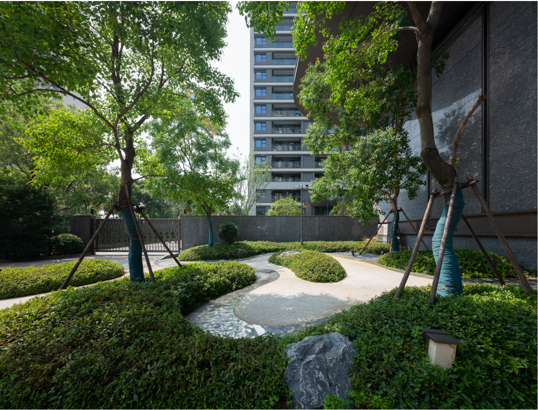 绿植设计以树形美观、四季常青的乔木为主,搭配色叶和开花植物,种植了染井吉野樱、金桂、鸡爪槭、朴树、乌桕、香樟、紫薇、三角枫、娜塔莉等,打造“春夏秋冬”四季不同植物主题节点,辅以倒伏式种植灌木,合理布局,给人们带来了视觉上的层次感和丰富度。以疏朗式乔木和云片式灌木结合形成的中心草坪景观,配以修剪整齐的绿篱迷宫,营造出浓密、层次分明的绿色环境。在静谧的空间氛围下,光影的变幻承载了时间的流转,给日常以自然与诗意。