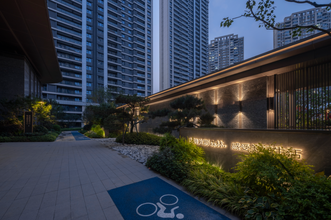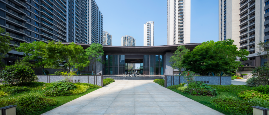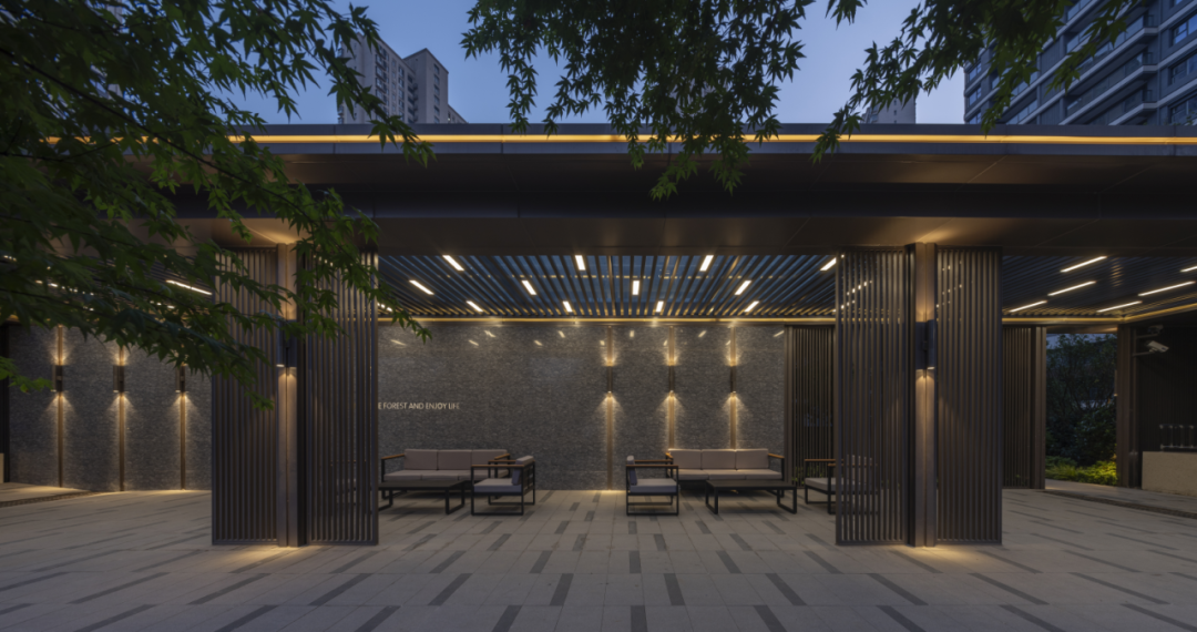 示范区承载着空间与记忆,是设计师关于景观、场所与人文思考的结晶。作为整个轴线的序曲,巧妙地运用石材的厚重、金属的质感与绿植的繁茂,交织出一幅现代主义的生活画卷。微风吹拂下,绿影婆娑,模糊了城市的喧嚣,营造出一片宁静而深邃的空间。