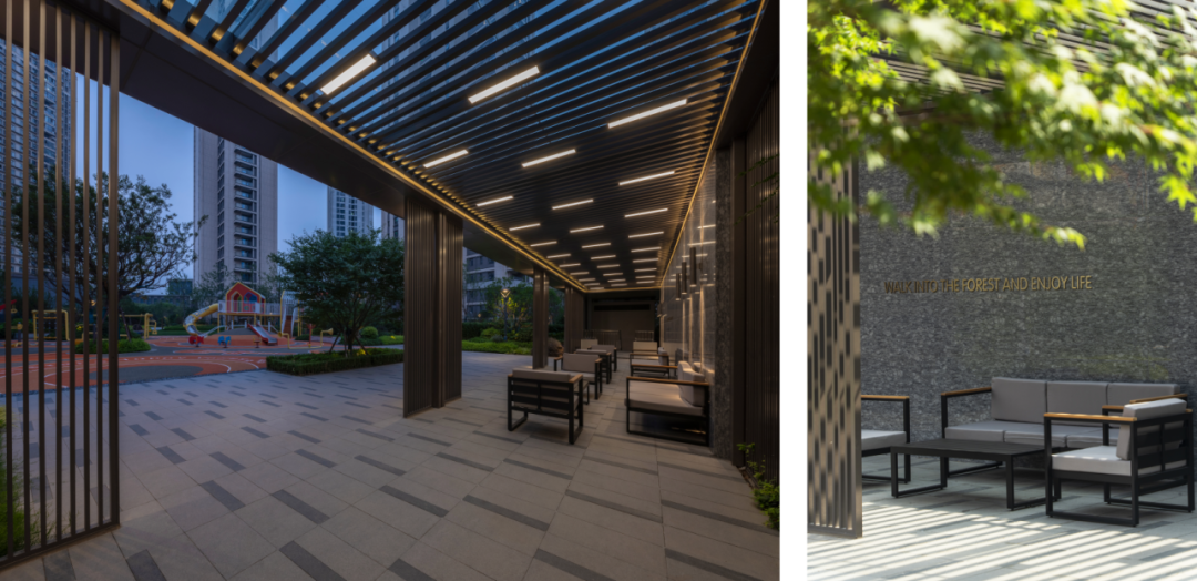 向前漫步是一个敞开的廊架景观,将自然与生活叠加相融,构造出一个理想生活的实验场所。流淌的绿意凝固了时间,同时又了筑成宁静深远的场地氛围。作为该区域的会客厅,这里是休闲交流、聚会放松的林间驿站。坐在此处,或一个人安静的冥想思考,或约上两三好友品茶叙旧,或望向远处孩童的嬉戏玩耍,静静感受时间的流动,让更多邻里故事在此缓慢生长。