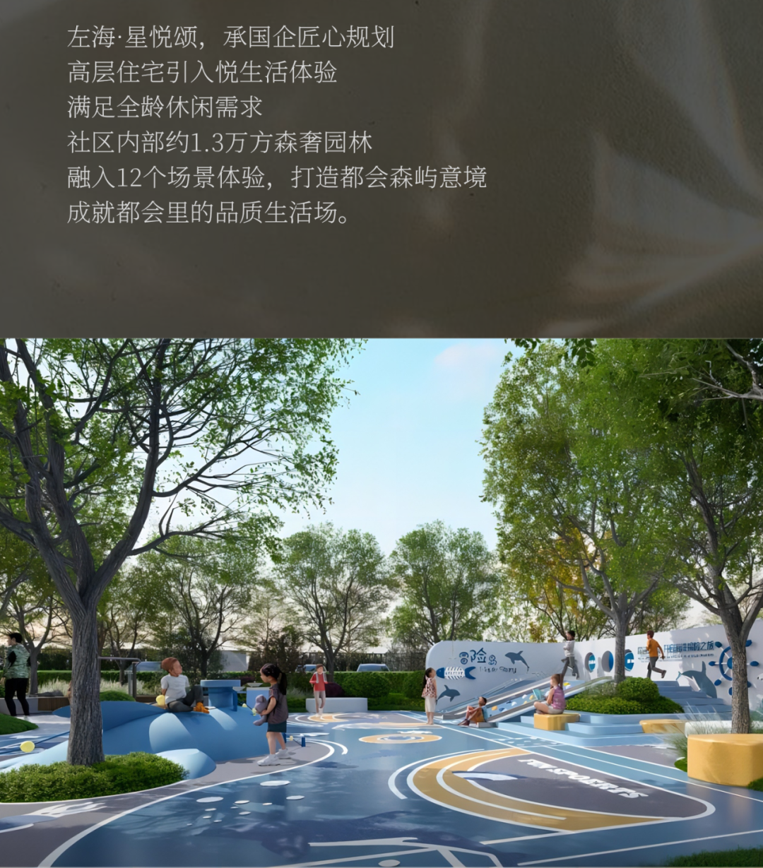 左海·星悦颂,承国企匠心规划 高层住宅引入悦生活体验 满足全龄休闲需求 社区内部约1.3万方森奢园林 融入12个场景体验,打造都会森屿意境 成就都会里的品质生活场。