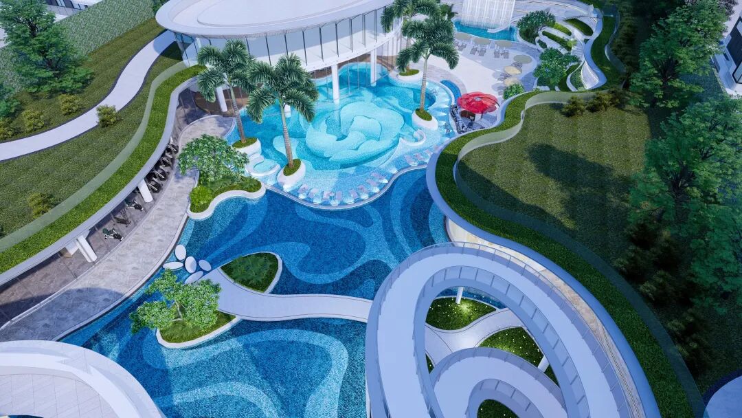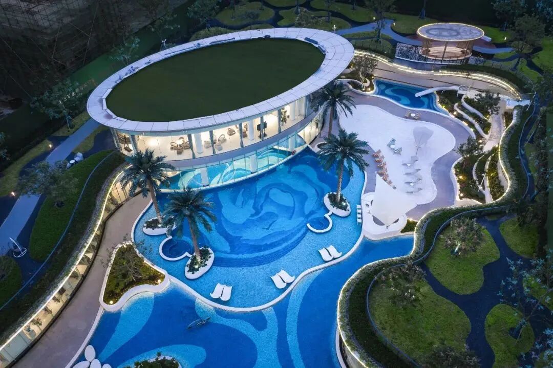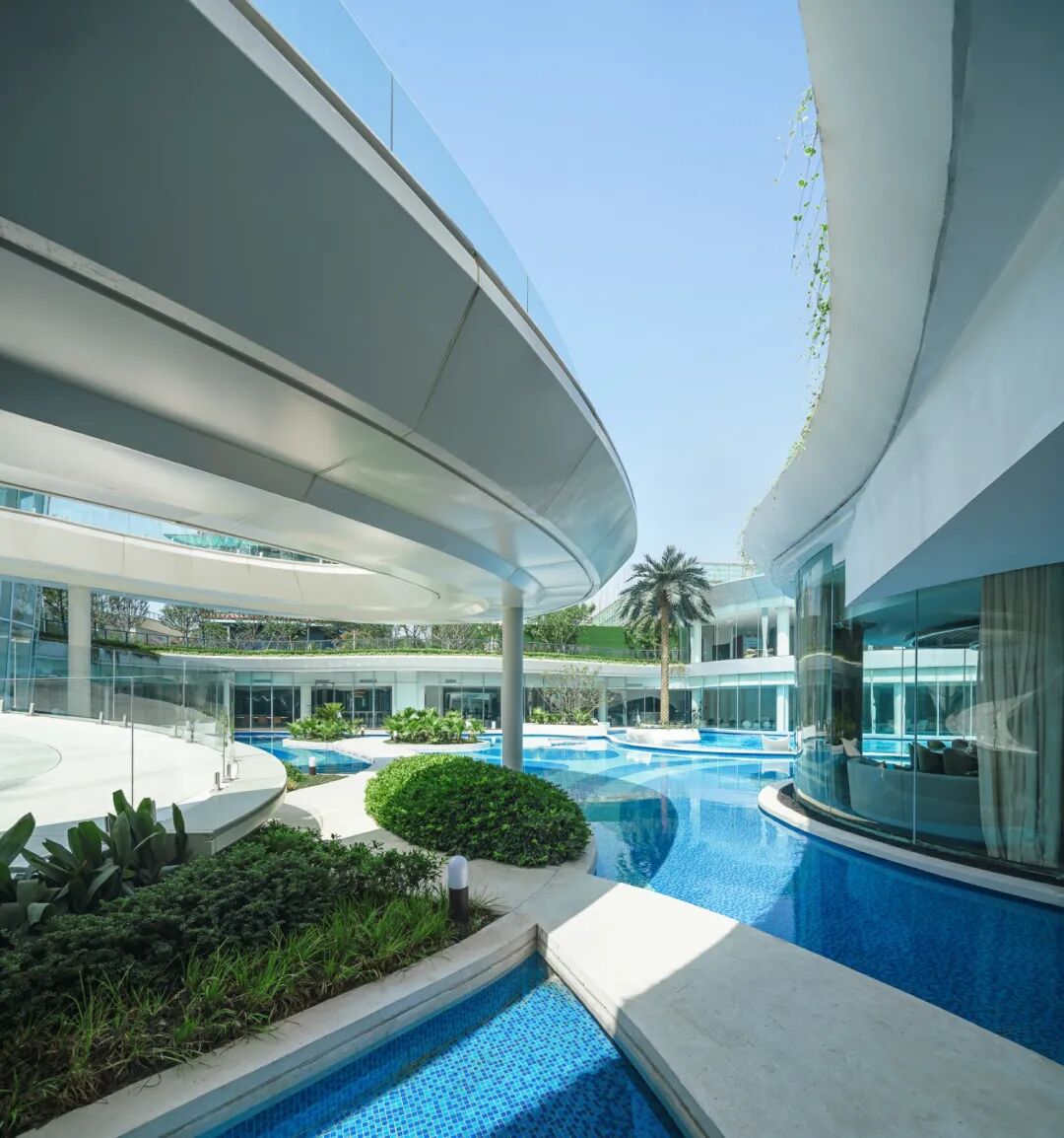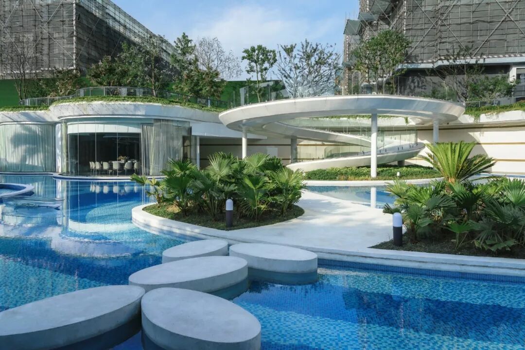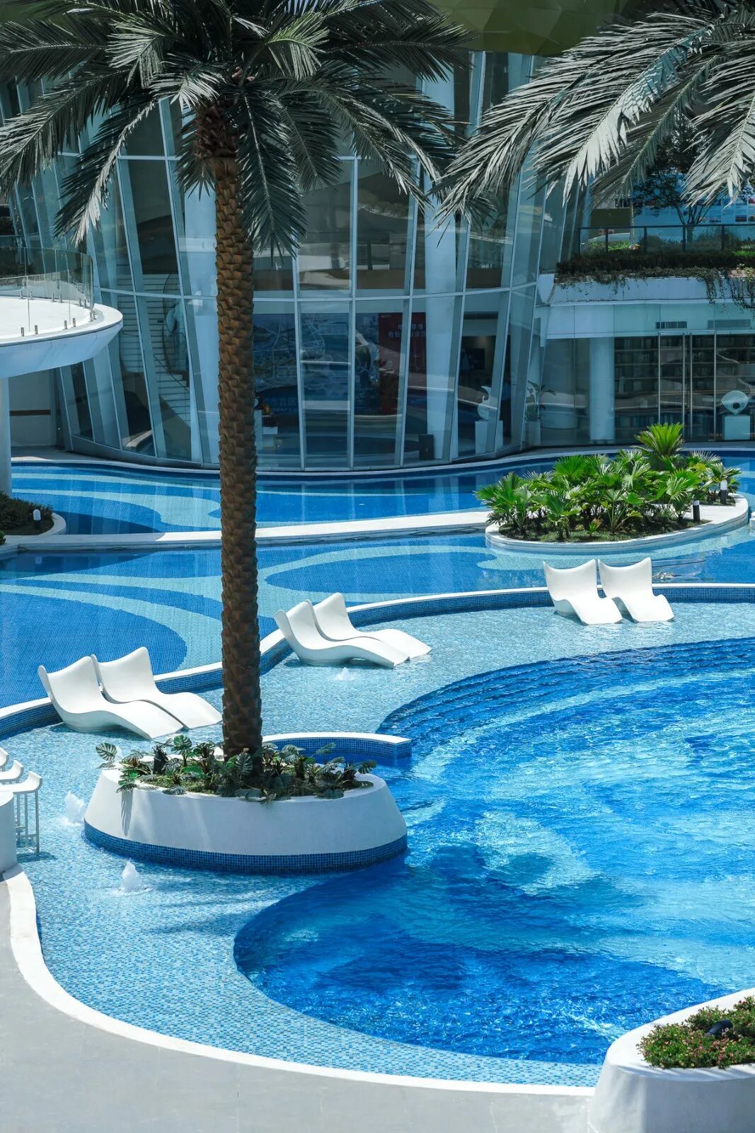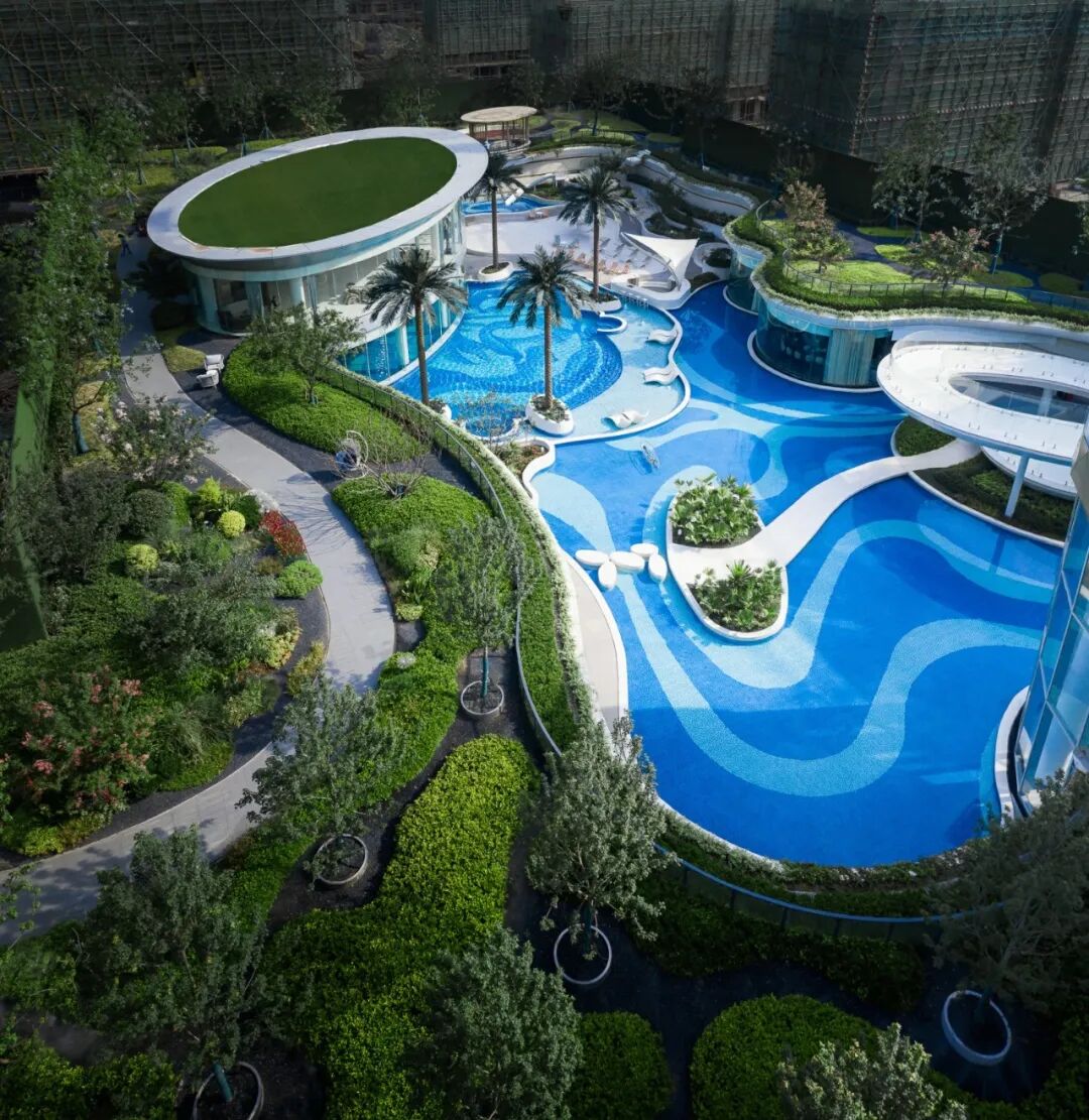 无锡,北倚长江、南滨太湖,被誉为“太湖明珠”。绿地香港 · 安兰诺雅地处无锡市滨湖区马山半岛、无锡的城市后花园、国家5A级风景区,坐拥湖光山色。从风光宜人的太湖获得灵感,结合建筑的游艇造型,将安兰诺雅打造成一片热带海岛风情的度假区。把海浪引到城市当中,椭圆形的汀步和绿岛,如水波荡漾的池底纹样,延续浪花元素。蔚蓝色的水面、白色的硬质铺地、绿色的棕榈植物,渲染着东南亚风情,又为夏日的高温带来一丝清凉。 Wuxi, with the Yangtze River in the north and Taihu Lake in the south, is known as the "Pearl of Taihu Lake". Greenland Hong Kong • Anlan Nuoya is located in Mashan Peninsula, Binhu District, Wuxi City, the back garden of Wuxi City, and a national 5A-level scenic spot, with lakes and mountains. Inspired by the beautiful Taihu Lake, combined with the yacht shape of the building, Anlan Nuoya has been built into a tropical island-style resort. Introducing the waves to the city, the oval-shaped steps and green islands, like the rippling pool bottom pattern, continue the elements of waves. The azure water surface, white hard paving, and green palm plants present a Southeast Asian style and bring a touch of coolness to the high temperature in summer.