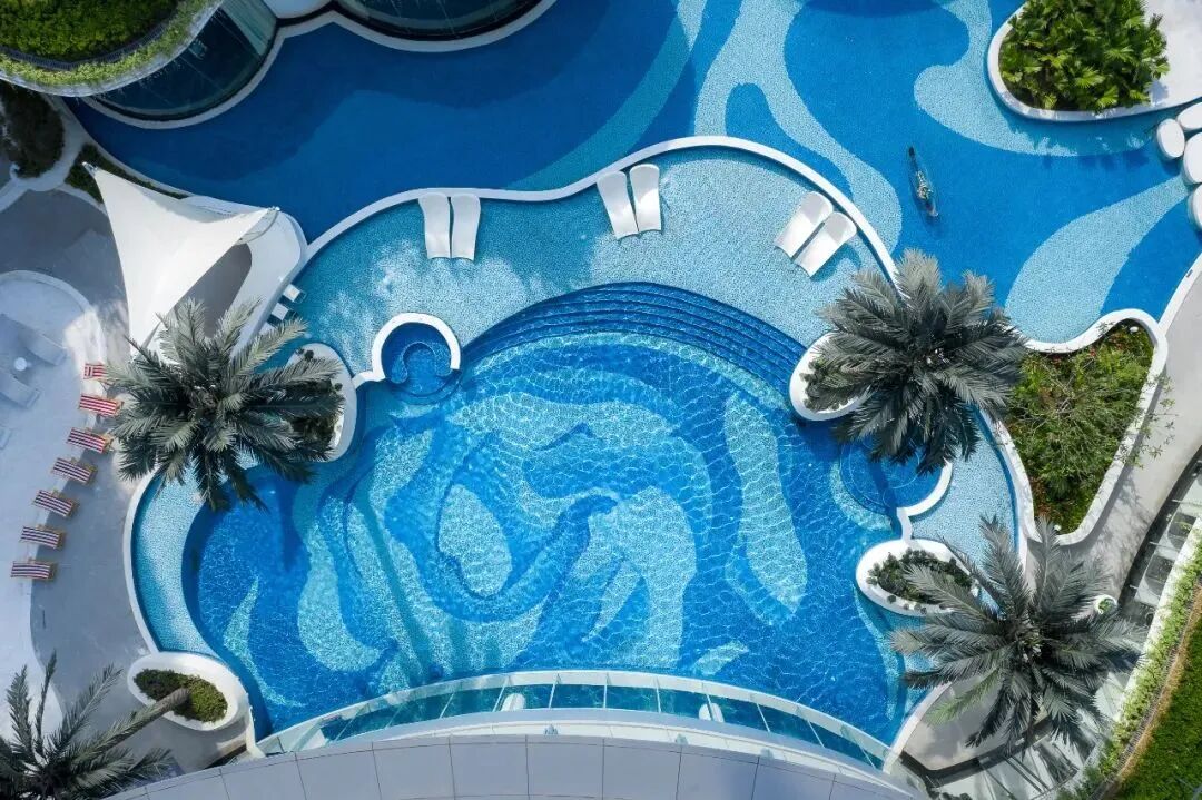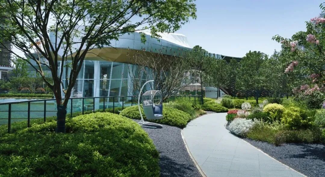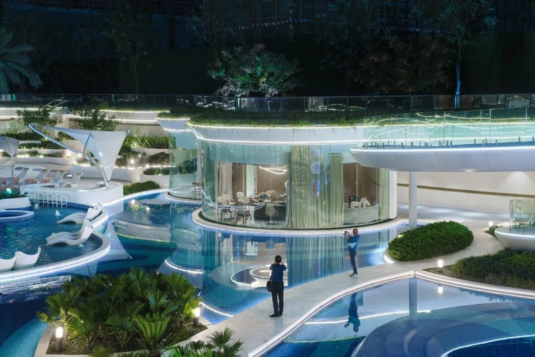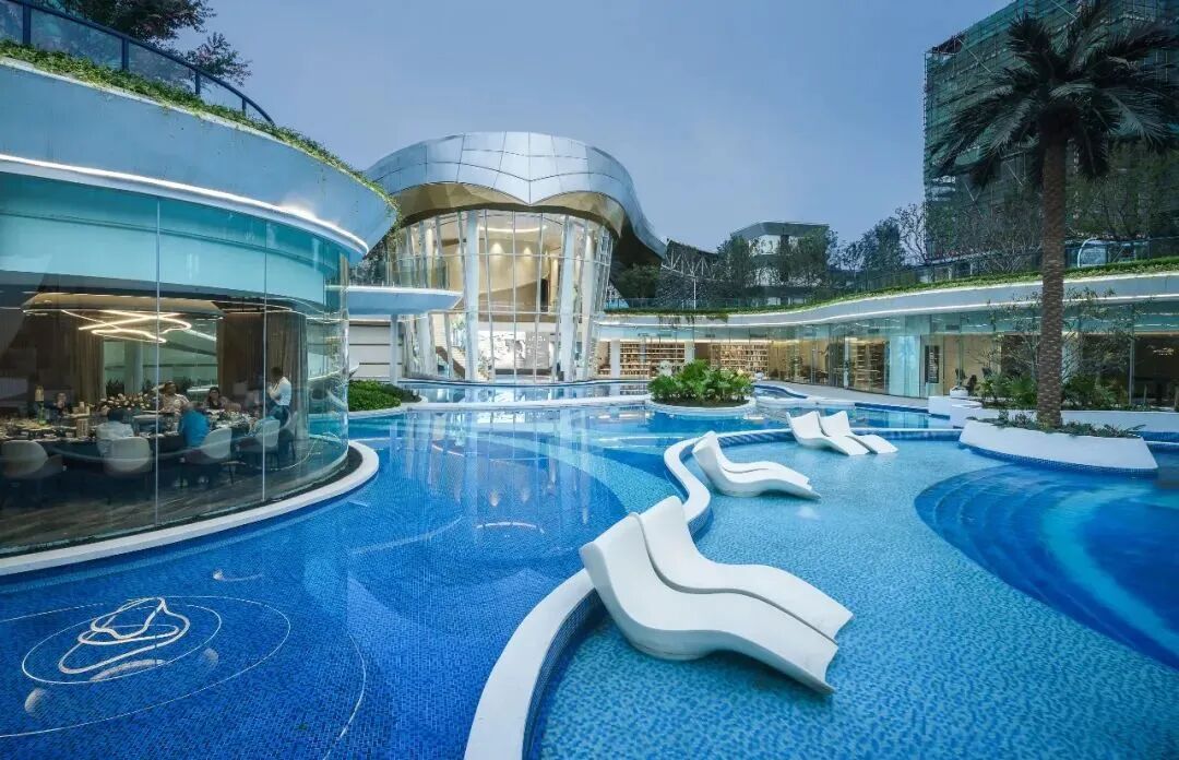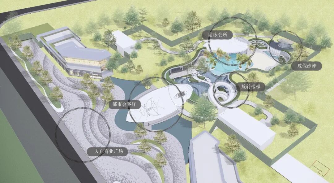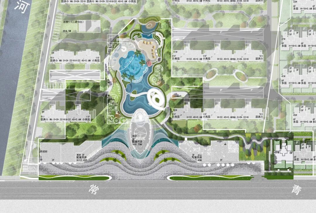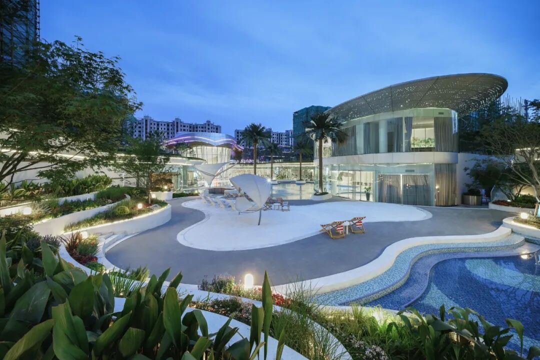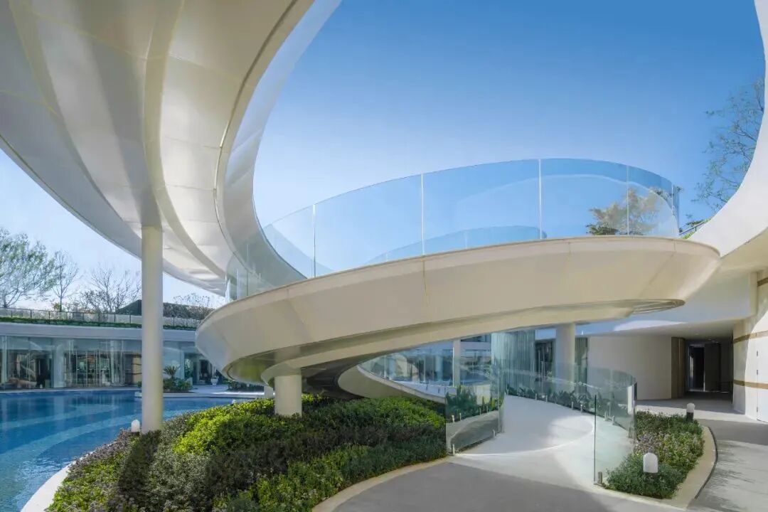 无锡,北倚长江、南滨太湖,被誉为“太湖明珠”。绿地香港 · 安兰诺雅地处无锡市滨湖区马山半岛、无锡的城市后花园、国家5A级风景区,坐拥湖光山色。从风光宜人的太湖获得灵感,结合建筑的游艇造型,将安兰诺雅打造成一片热带海岛风情的度假区。把海浪引到城市当中,椭圆形的汀步和绿岛,如水波荡漾的池底纹样,延续浪花元素。蔚蓝色的水面、白色的硬质铺地、绿色的棕榈植物,渲染着东南亚风情,又为夏日的高温带来一丝清凉。 Wuxi, with the Yangtze River in the north and Taihu Lake in the south, is known as the "Pearl of Taihu Lake". Greenland Hong Kong • Anlan Nuoya is located in Mashan Peninsula, Binhu District, Wuxi City, the back garden of Wuxi City, and a national 5A-level scenic spot, with lakes and mountains. Inspired by the beautiful Taihu Lake, combined with the yacht shape of the building, Anlan Nuoya has been built into a tropical island-style resort. Introducing the waves to the city, the oval-shaped steps and green islands, like the rippling pool bottom pattern, continue the elements of waves. The azure water surface, white hard paving, and green palm plants present a Southeast Asian style and bring a touch of coolness to the high temperature in summer.