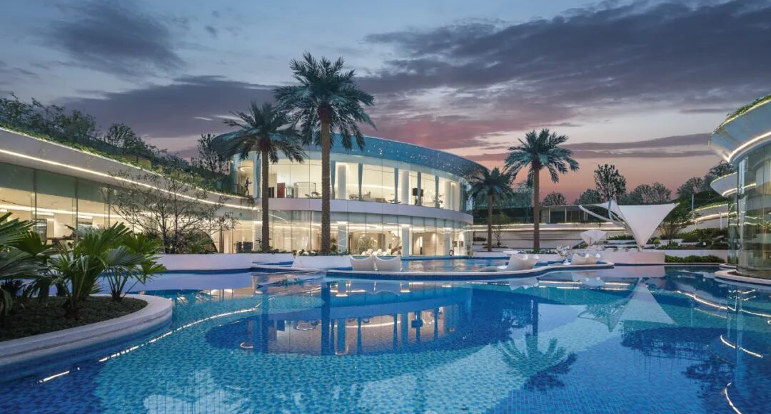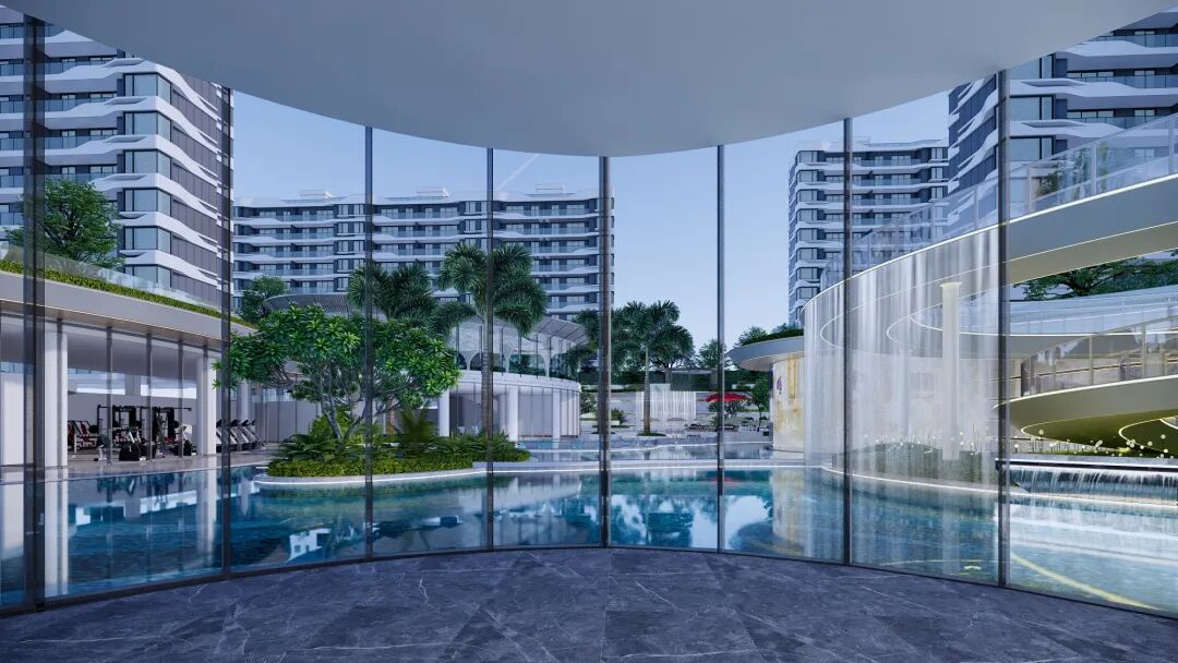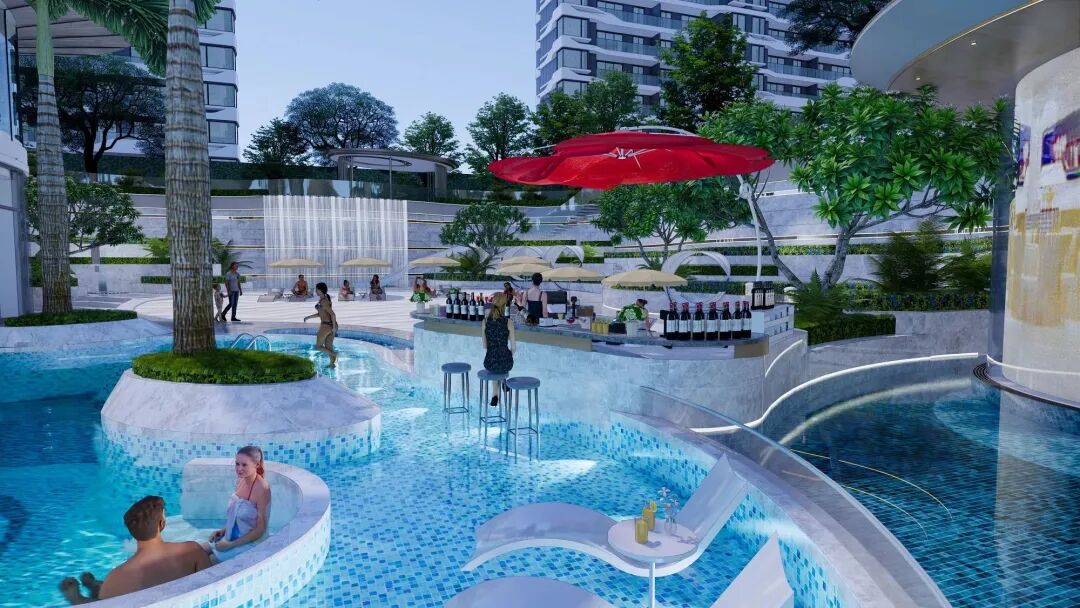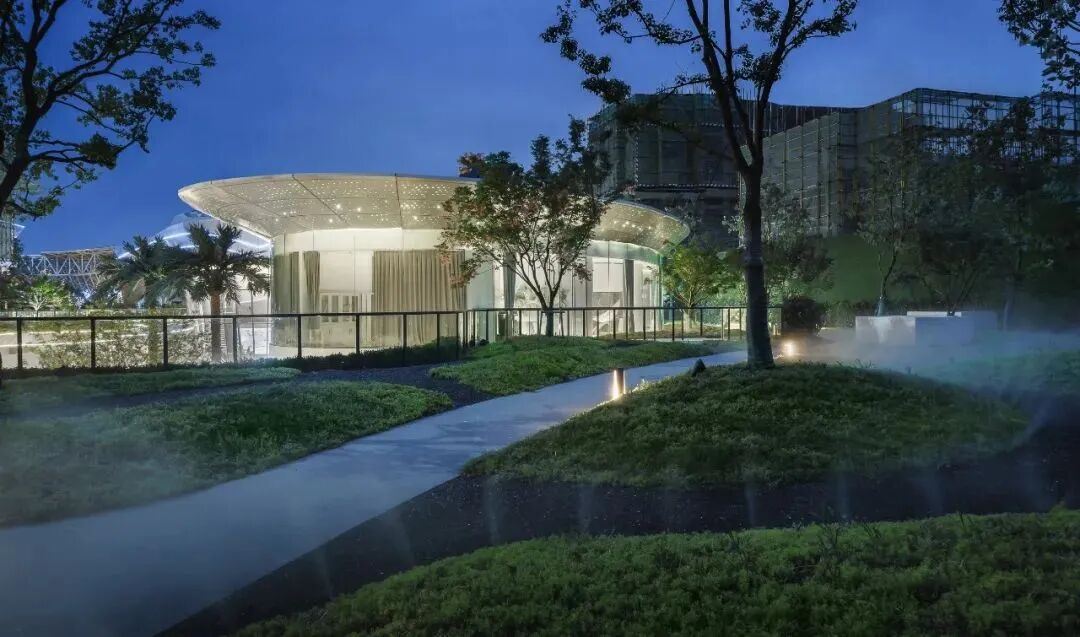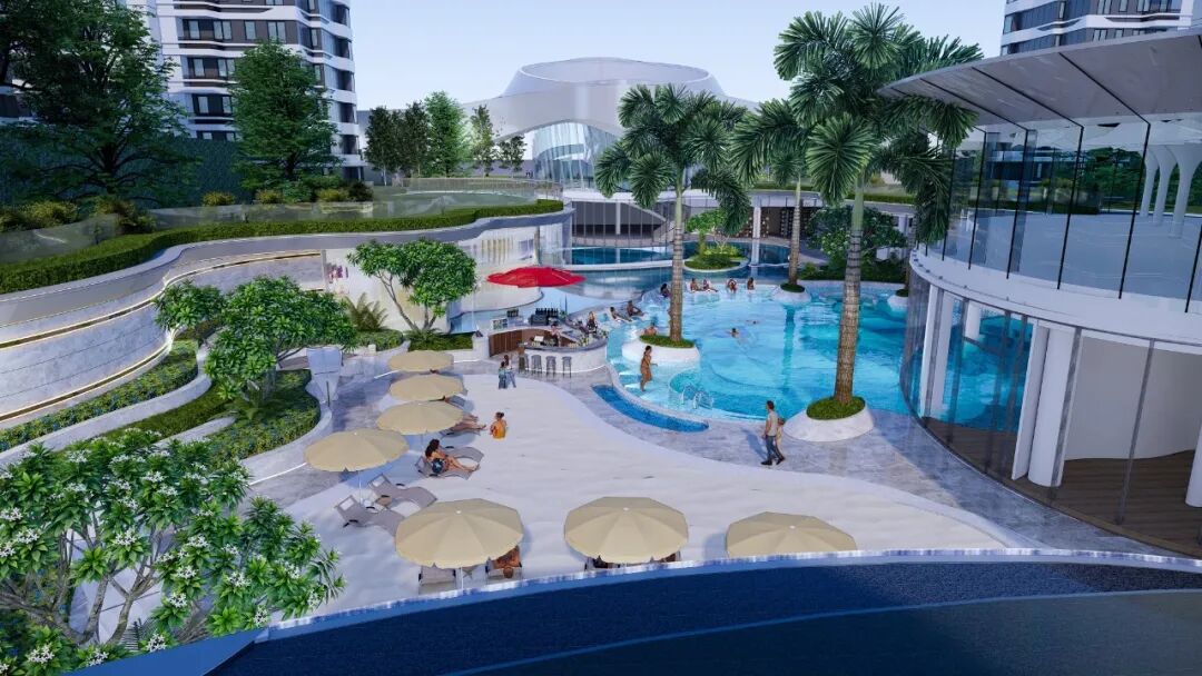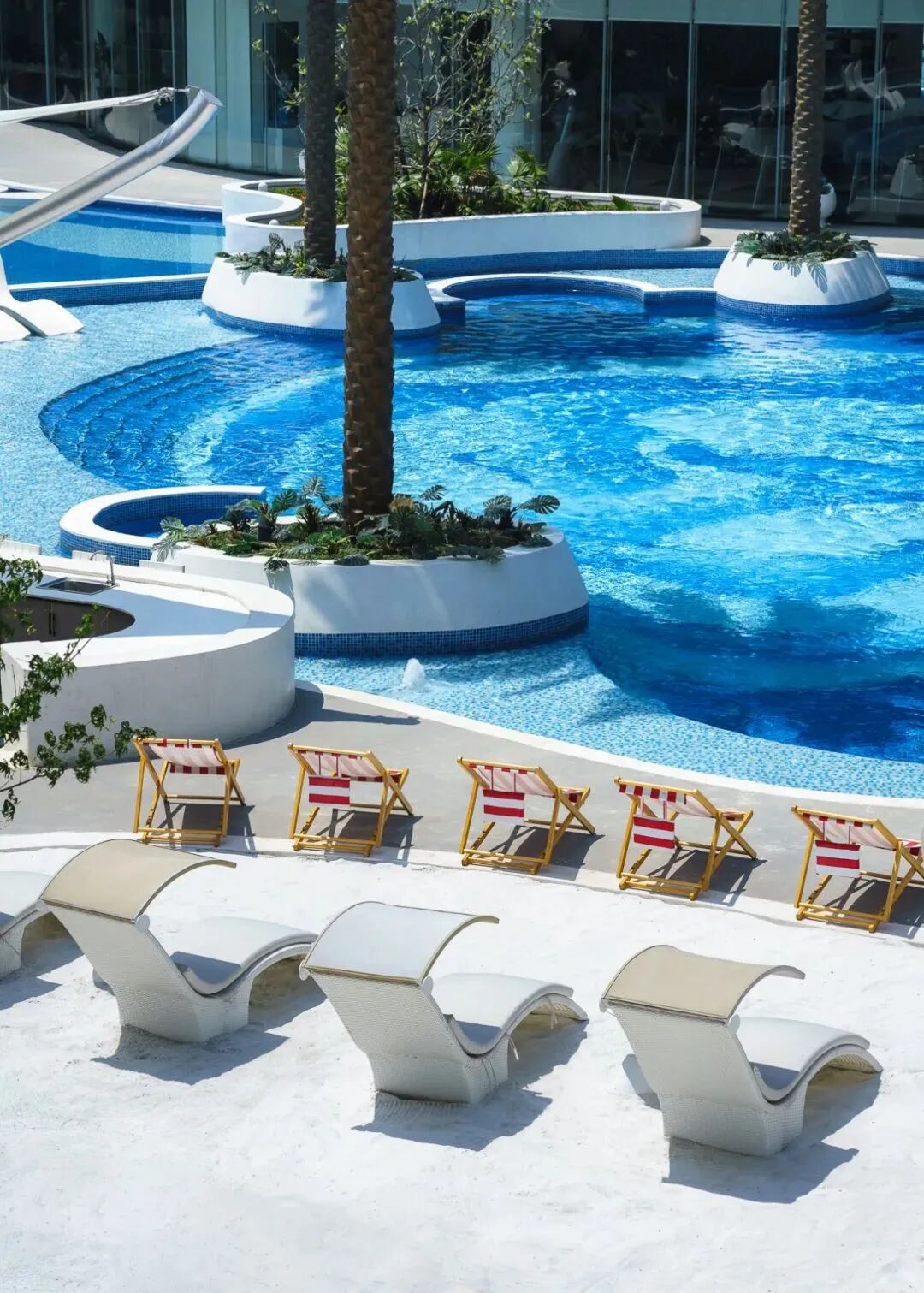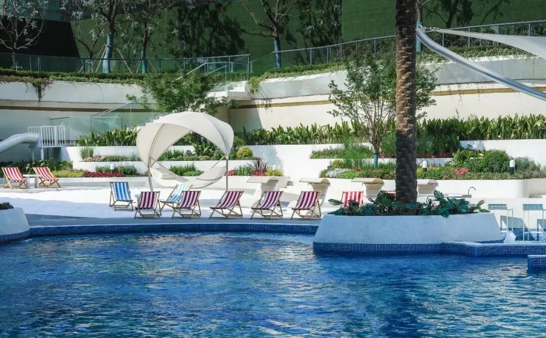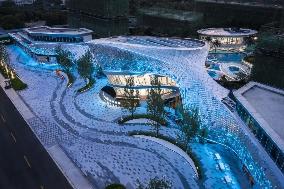 无锡,北倚长江、南滨太湖,被誉为“太湖明珠”。绿地香港 · 安兰诺雅地处无锡市滨湖区马山半岛、无锡的城市后花园、国家5A级风景区,坐拥湖光山色。从风光宜人的太湖获得灵感,结合建筑的游艇造型,将安兰诺雅打造成一片热带海岛风情的度假区。把海浪引到城市当中,椭圆形的汀步和绿岛,如水波荡漾的池底纹样,延续浪花元素。蔚蓝色的水面、白色的硬质铺地、绿色的棕榈植物,渲染着东南亚风情,又为夏日的高温带来一丝清凉。 Wuxi, with the Yangtze River in the north and Taihu Lake in the south, is known as the "Pearl of Taihu Lake". Greenland Hong Kong • Anlan Nuoya is located in Mashan Peninsula, Binhu District, Wuxi City, the back garden of Wuxi City, and a national 5A-level scenic spot, with lakes and mountains. Inspired by the beautiful Taihu Lake, combined with the yacht shape of the building, Anlan Nuoya has been built into a tropical island-style resort. Introducing the waves to the city, the oval-shaped steps and green islands, like the rippling pool bottom pattern, continue the elements of waves. The azure water surface, white hard paving, and green palm plants present a Southeast Asian style and bring a touch of coolness to the high temperature in summer.