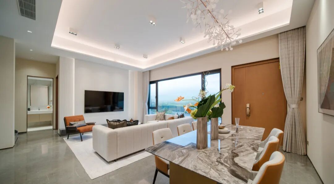 步入一楼便是自在悠然的客厅空间,四方格局开阔空间,未来这里便是家庭会客场所,邀请朋友聚会畅饮再合适不过。一楼还匠心独运配置了一个卧室空间,是为方便老人使用,但紫悦台别墅已经配置电梯,未来紫悦台业主入住后一楼卧室可以移至二楼,让客厅空间更阔绰,更舒适。