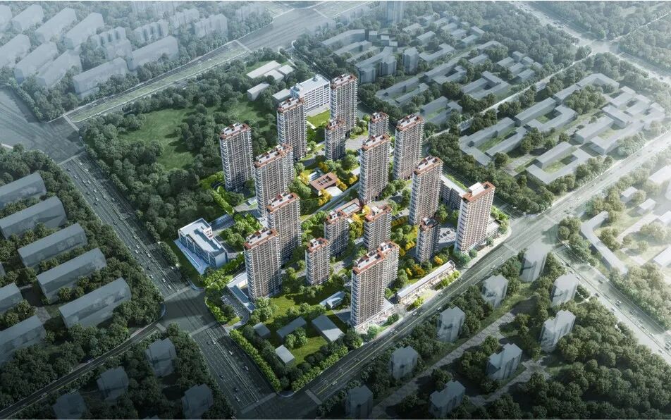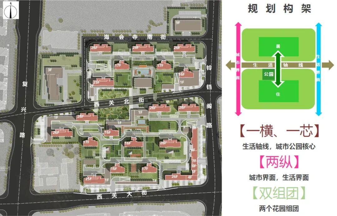在老城腹地空间边界模糊、用地条件较为复杂的条件下,怎样利用有限的资源,多地块整体规划考量,在延续在地文脉、保证老城烟火活力,极力避免新建社区与老城厢周边形成一种割裂感的同时,使云麓公馆成为脱颖而出的高品质居住社区,是在规划设计时重点探索的方向。 通过多轮方案的对比,充分分析地块优势及价值点,最终确定以“城市公园”作为设计策略的核心,依托城市道路和公园绿地,规划“一轴”&“两园”&“四芯”,的布局,强化“公园”的资源辐射,营造出则显,入则藏的缦系隐奢社区。 商业及服务配套布置于住宅地块之间的西关北街及复兴路一侧,巧借地块间现状道路,打造“生活休闲轴”,多功能商业街激活生活氛围,保证老城新社区应有的烟火繁华。 ▲整体鸟瞰