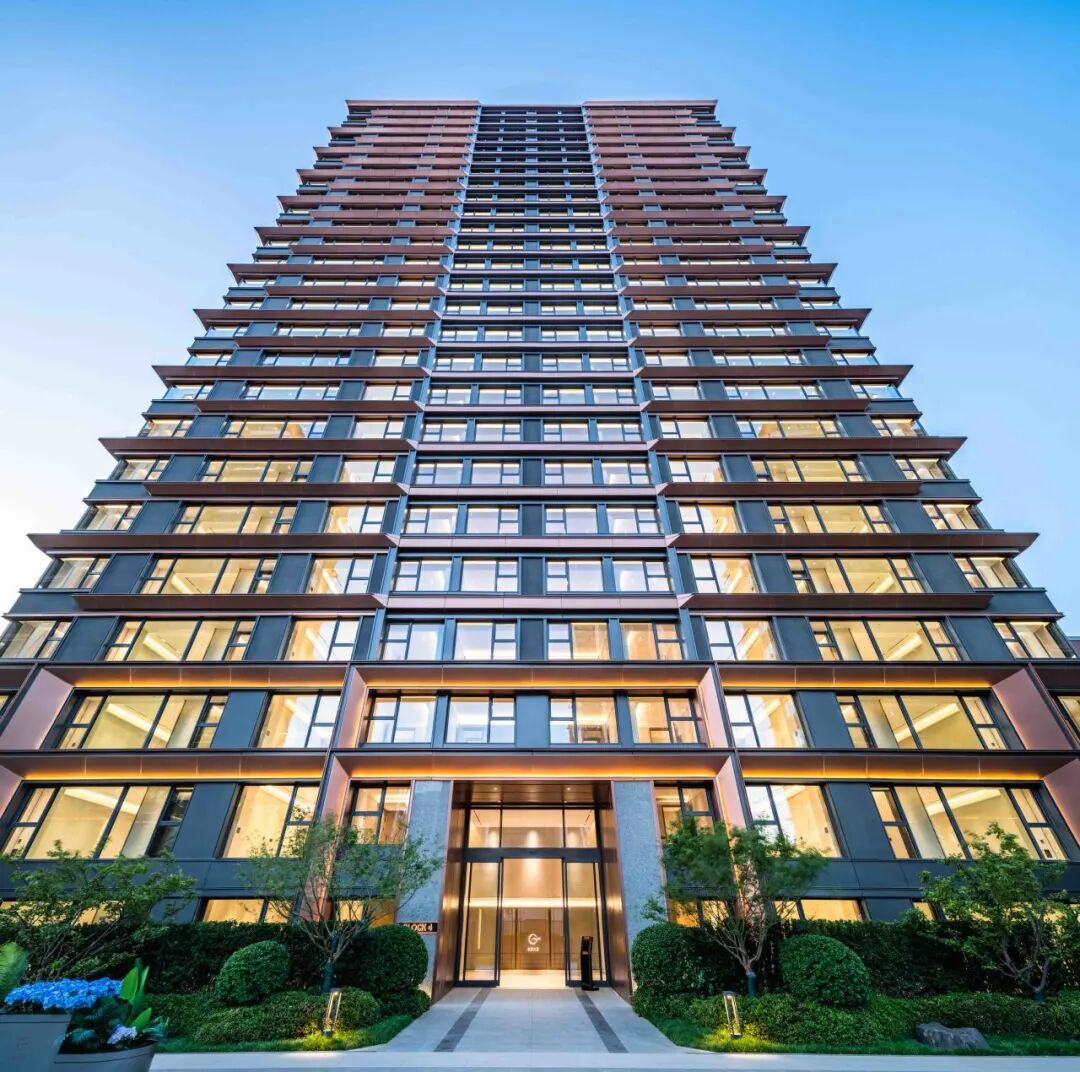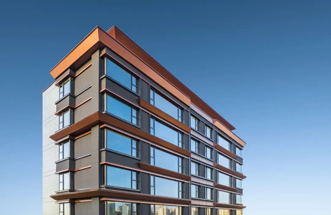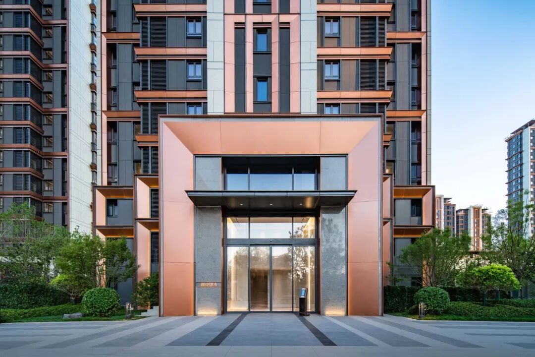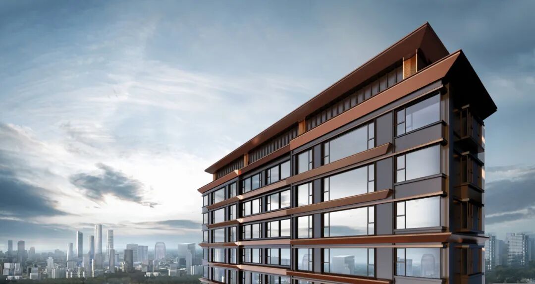 充分利用玻璃的通透和镜面反射的特点,由内而外实现景观视野的最大化;转角窗的使用,实现270°观景效果引景入内,户内观景无遮挡,落地窗设计,实景观视野最大化。 建筑色彩的选择上,提取传统建筑色彩,打造沉着内敛,经得起时间沉淀的立面肌理。仿铜铝板+浅灰色铝线条、仿铜色线条为立面增加一丝温度,营造温馨、浪漫的生活氛围。 建筑整体采用流畅的一体式铝板和幕墙工艺,灰色型材及窗框收边使建筑于细节处体现力量感;通过色彩渲染和细节刻画,使立面既具有公共建筑前卫精致的特色,又不失住宅建筑温暖宜居的本质。