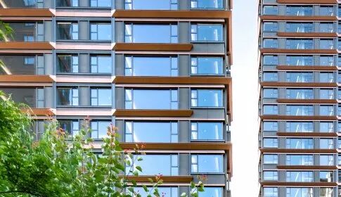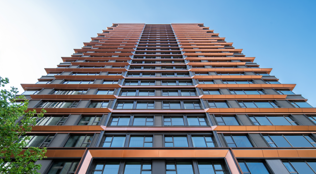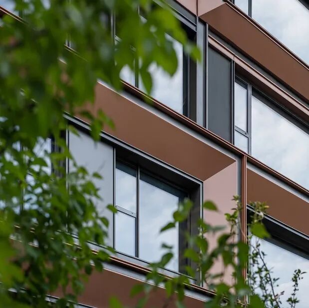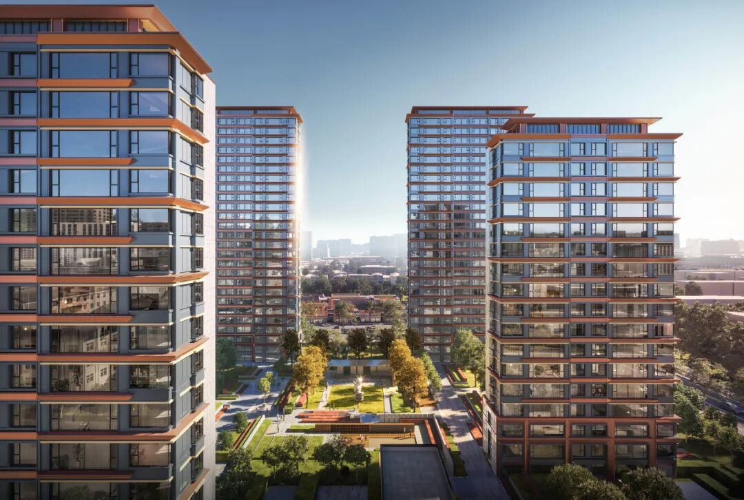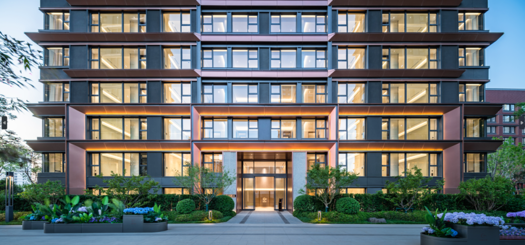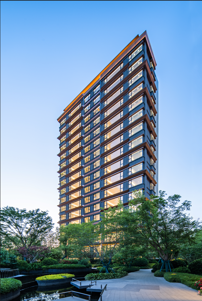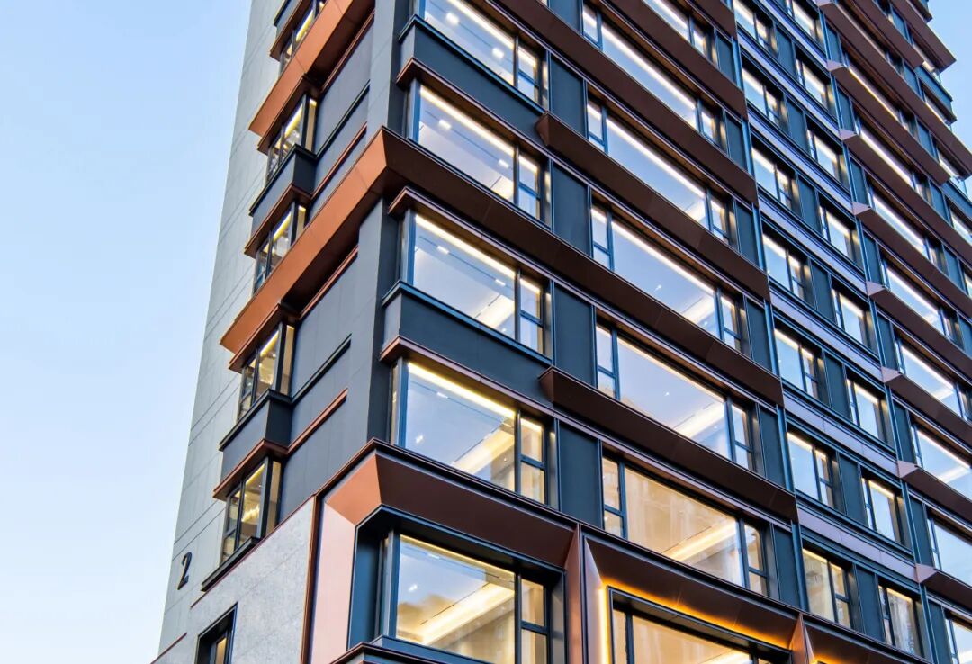 充分利用玻璃的通透和镜面反射的特点,由内而外实现景观视野的最大化;转角窗的使用,实现270°观景效果引景入内,户内观景无遮挡,落地窗设计,实景观视野最大化。 建筑色彩的选择上,提取传统建筑色彩,打造沉着内敛,经得起时间沉淀的立面肌理。仿铜铝板+浅灰色铝线条、仿铜色线条为立面增加一丝温度,营造温馨、浪漫的生活氛围。 建筑整体采用流畅的一体式铝板和幕墙工艺,灰色型材及窗框收边使建筑于细节处体现力量感;通过色彩渲染和细节刻画,使立面既具有公共建筑前卫精致的特色,又不失住宅建筑温暖宜居的本质。