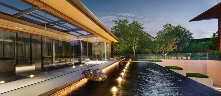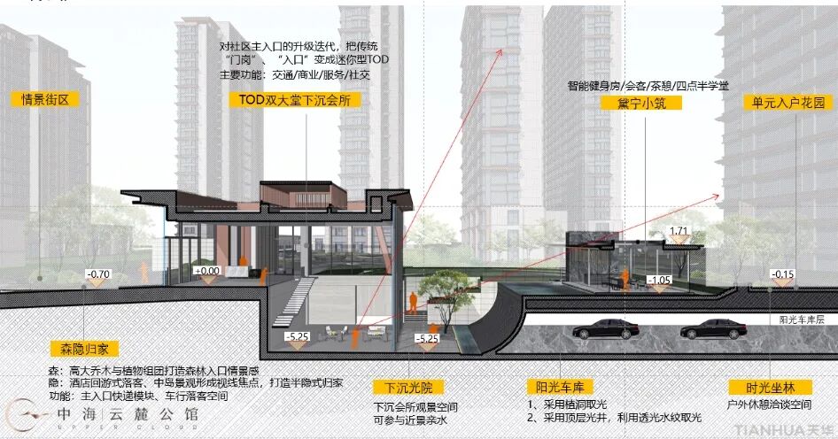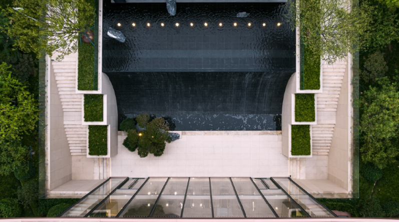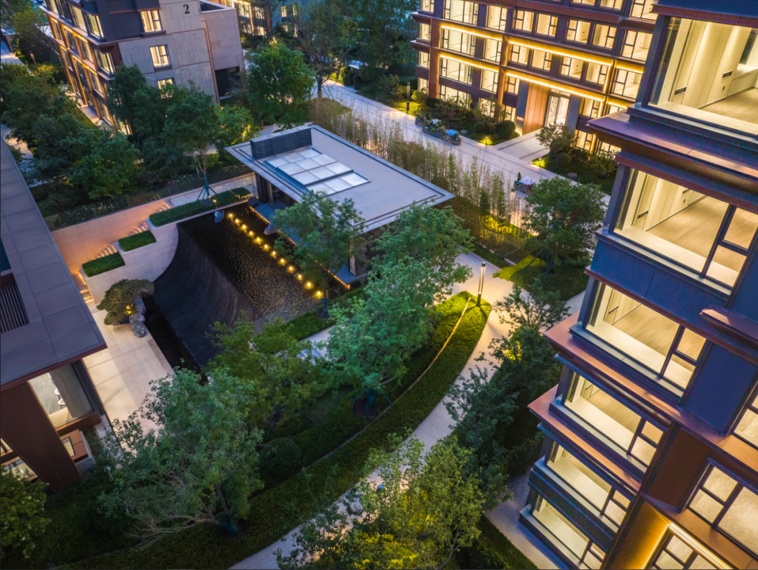 下沉庭院—建筑与景观融合设计,项目从社区入口大堂到归家单元门户,在建筑、景观、室内一体结合设计下,建立了高度融合的立体归家系统,让归家成为一次如度假般的缦系之旅。