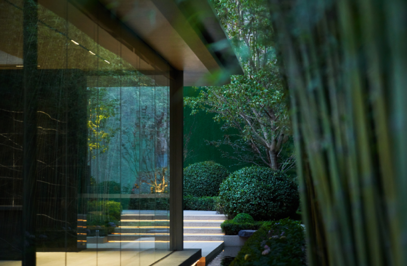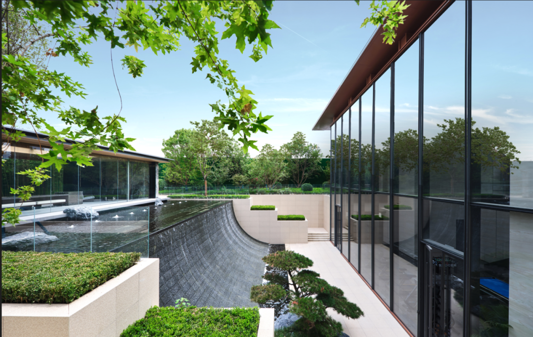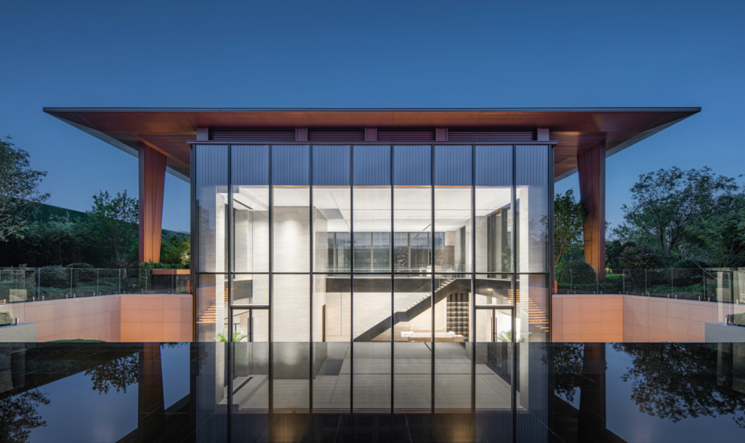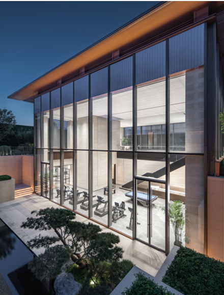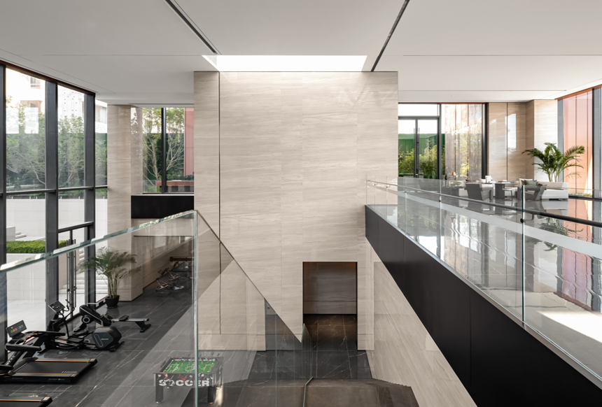 会所与下沉庭院,通过递进的空间高度变化、共享与通高玻璃幕墙让空间流动起来,以流动空间串联地上和地下空间,组织会所功能,带了连续内敛、层级丰富的空间体验。