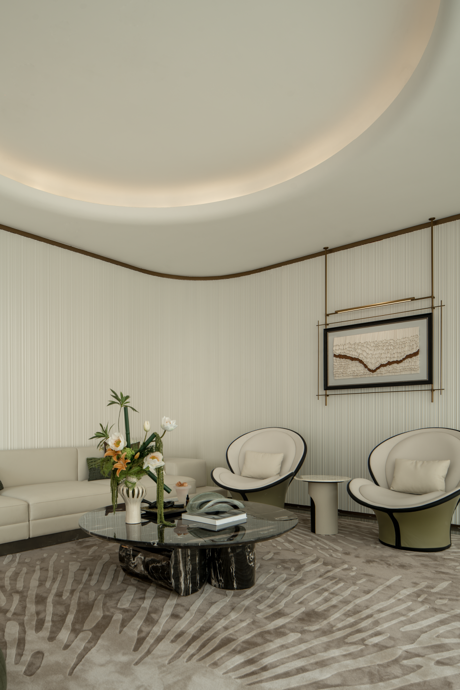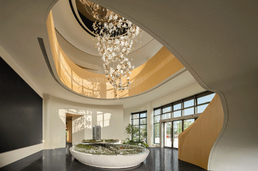旋转楼梯如同时间的螺旋,引领着空间的流动与秩序。垂坠而下的晶莹花瓣装置,轻盈而充满张力,映射出自然与人造之间的和谐共生。大面积通透玻璃将室内外景色融为一体,赋予空间无限延展的想象。