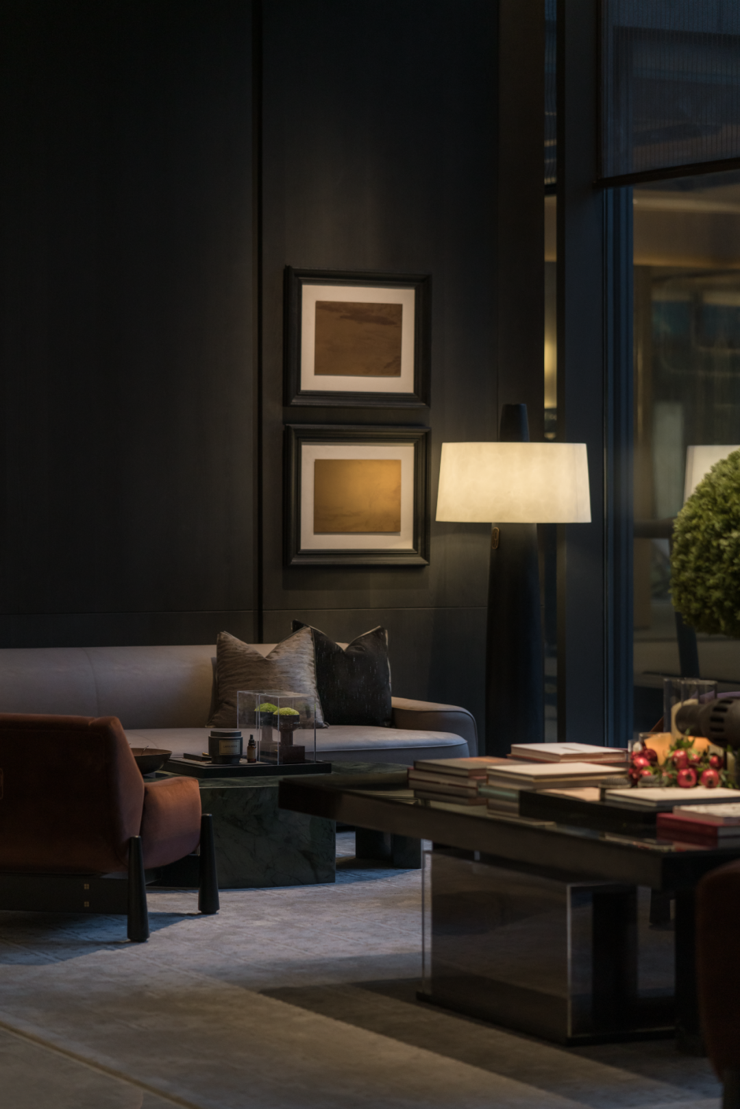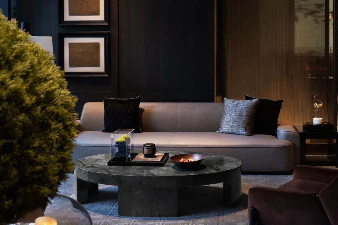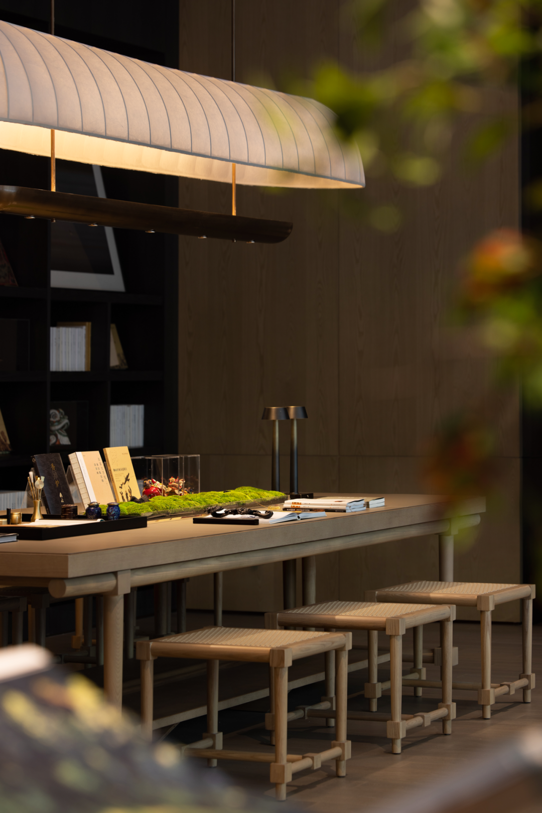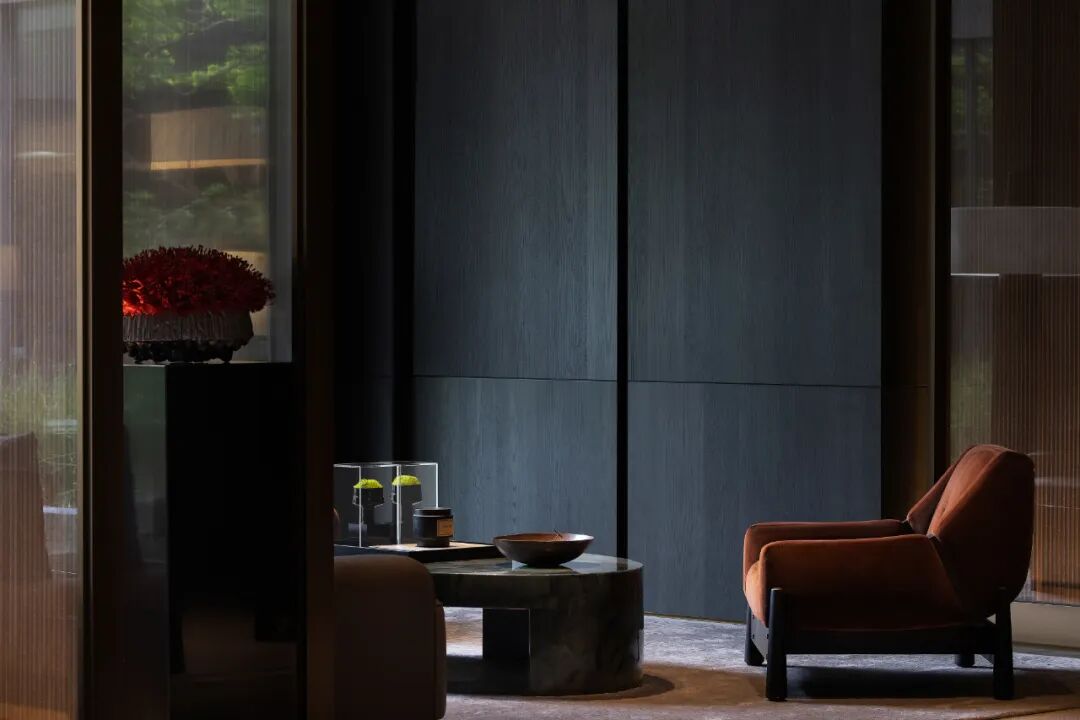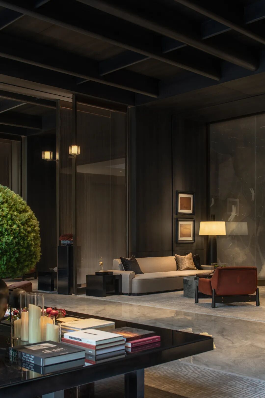 重心下移,人们的视线由此从庞大的空间秩序中游离出来,重新聚焦于身边之物的细部。布艺织品密实的触感,黄铜复古的质地,皮质扶手细腻的光泽,皆以一种流畅的美学语言,将空间视觉形象中的低调品味、矜贵内涵一以贯之。