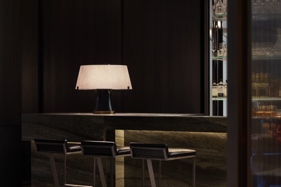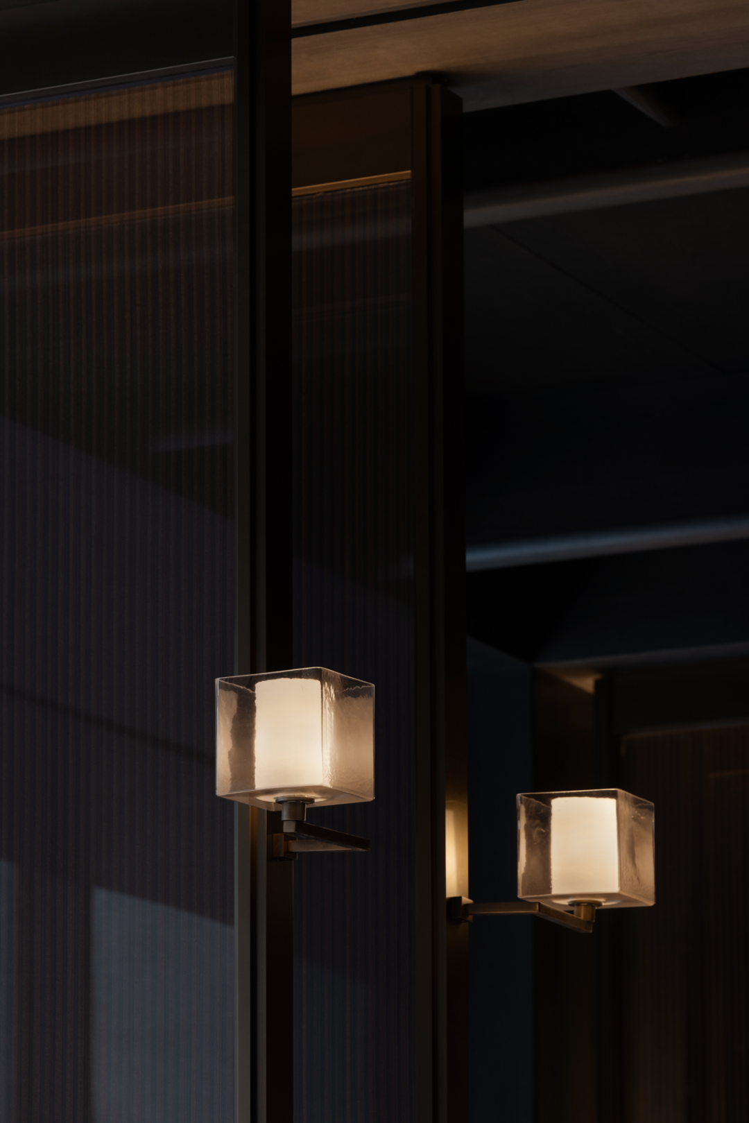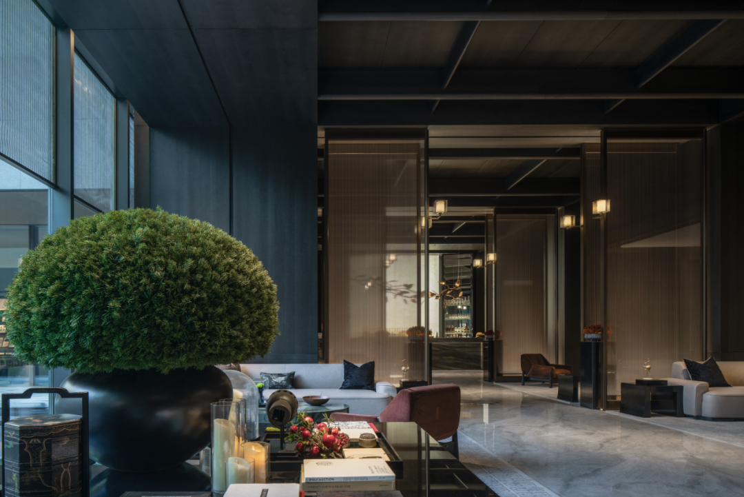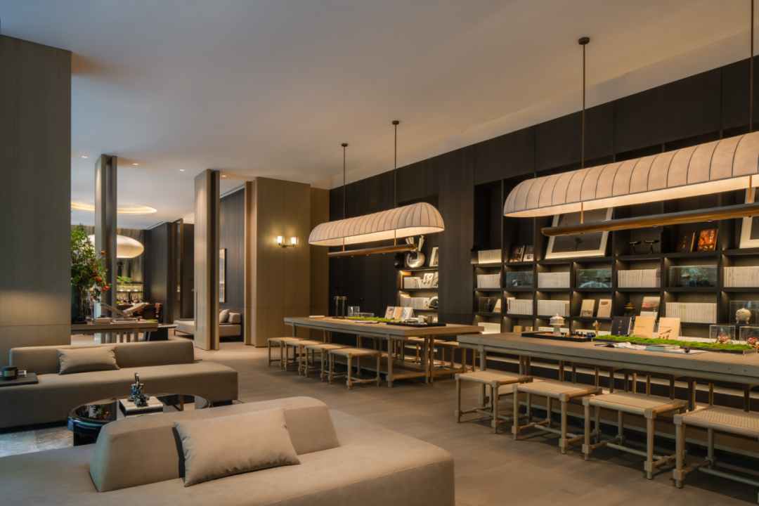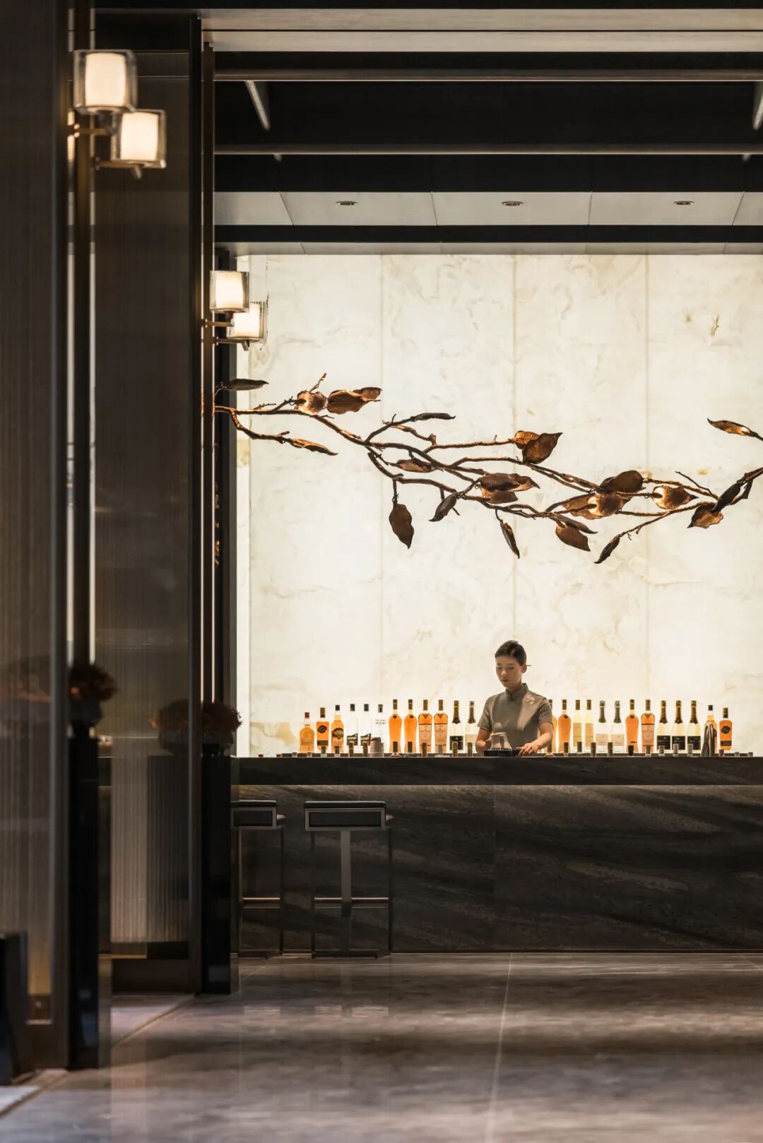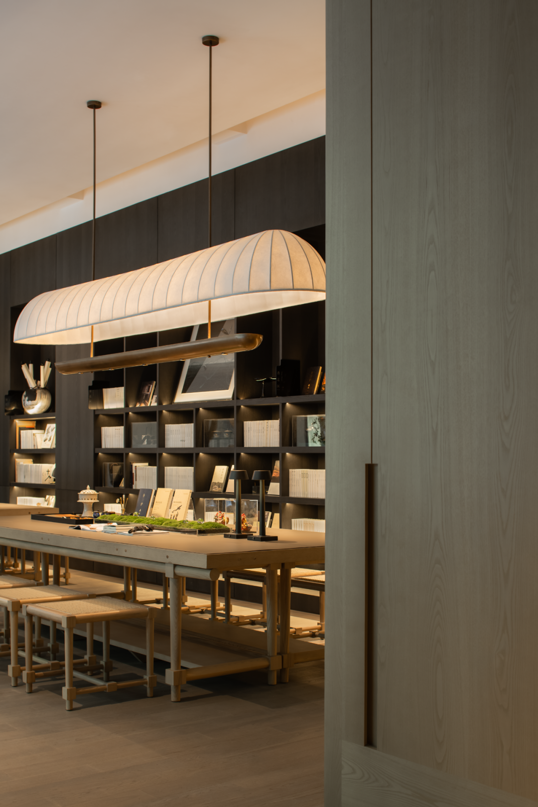 重心下移,人们的视线由此从庞大的空间秩序中游离出来,重新聚焦于身边之物的细部。布艺织品密实的触感,黄铜复古的质地,皮质扶手细腻的光泽,皆以一种流畅的美学语言,将空间视觉形象中的低调品味、矜贵内涵一以贯之。