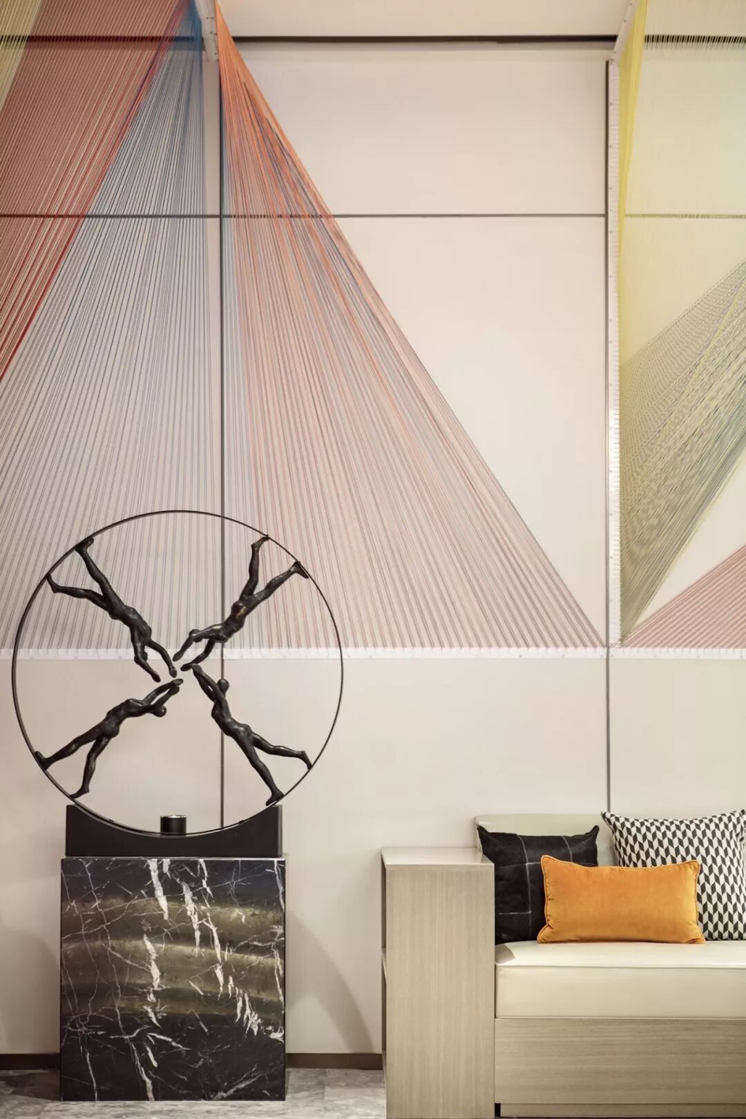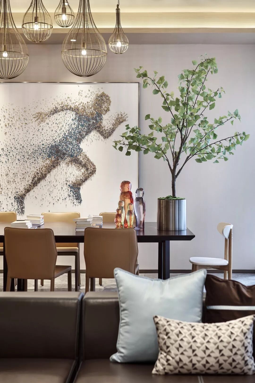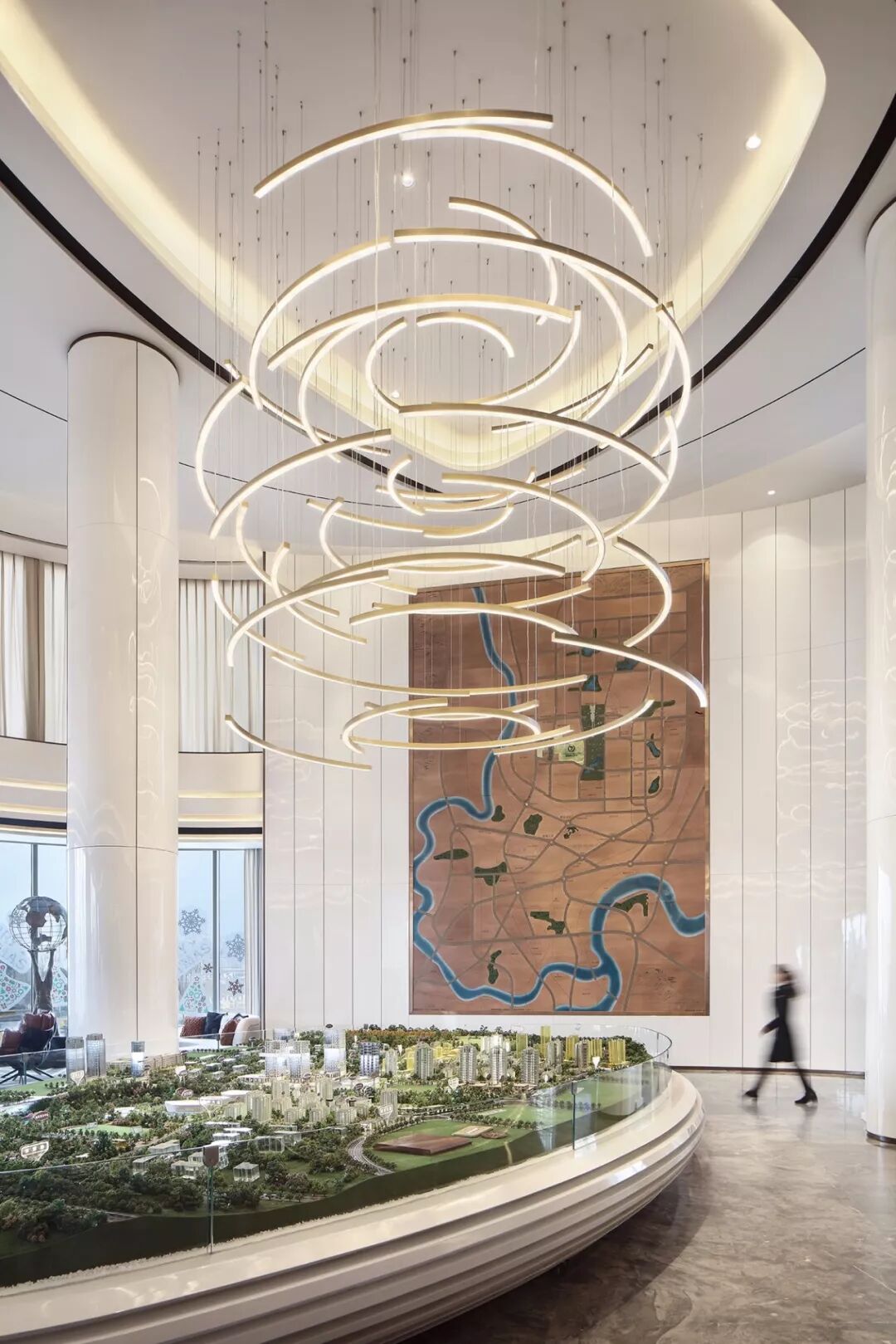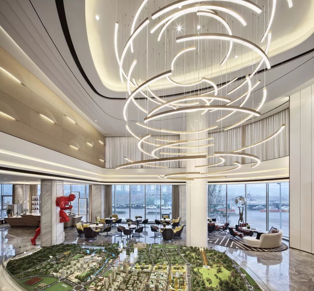 一楼大厅大面积落地窗将室外美景一览无余引入室内,红色运动人物雕塑将视线聚焦于此,极具动感与视觉张力,大型弧形线状吊灯从上而下飘洒而至,打破空间原本沉闷的布局,为空间带来更多生气。