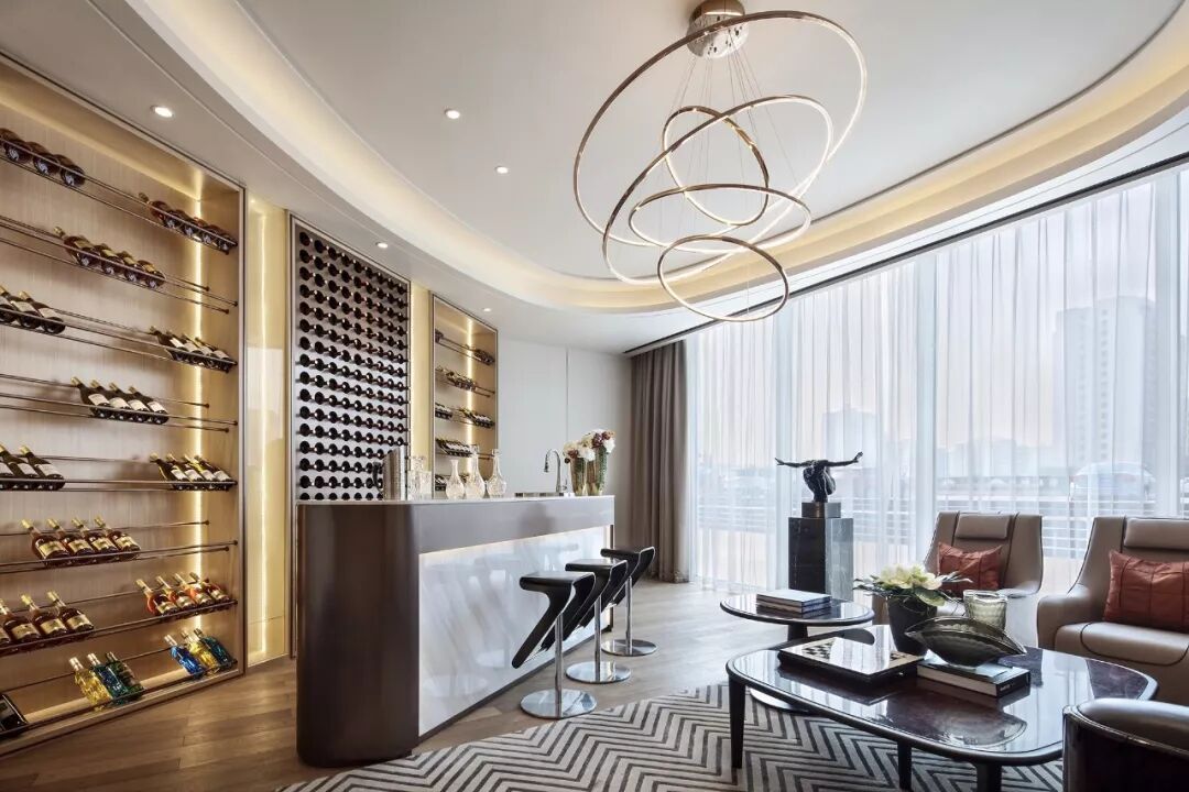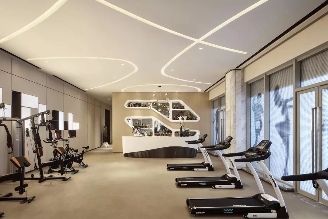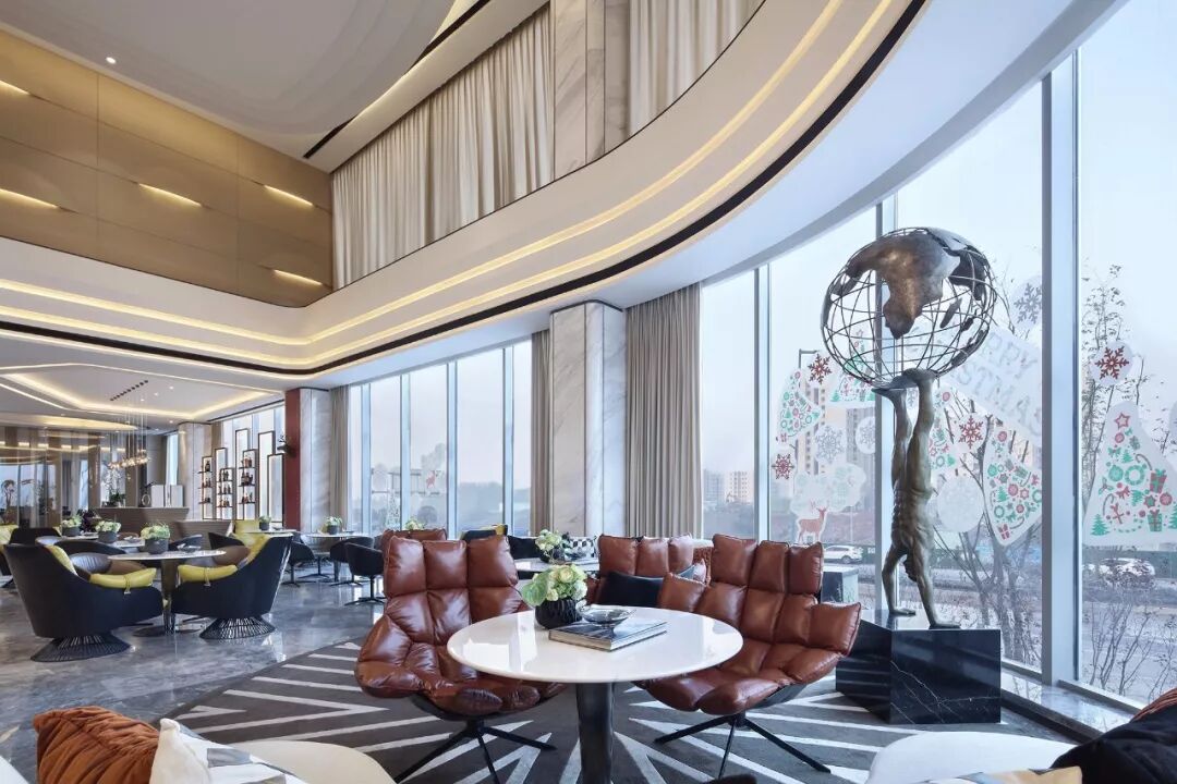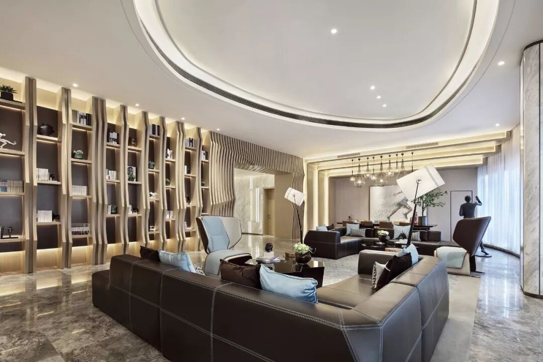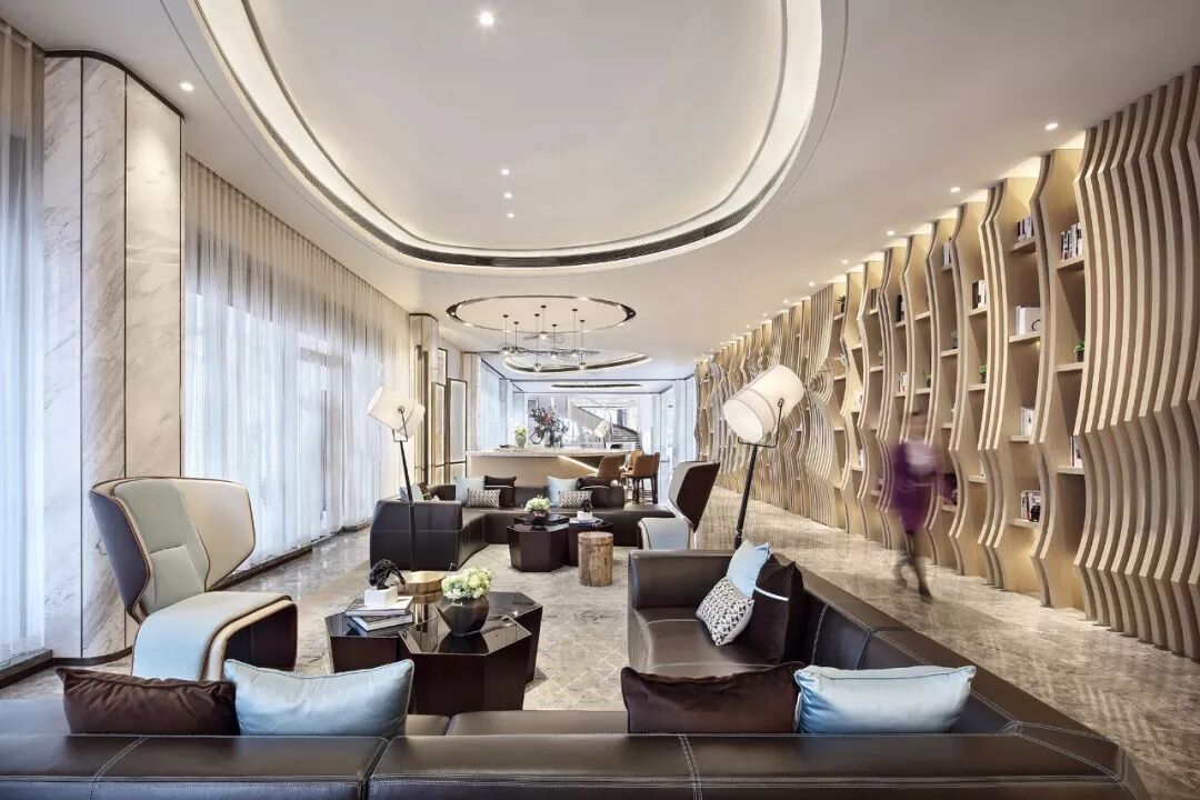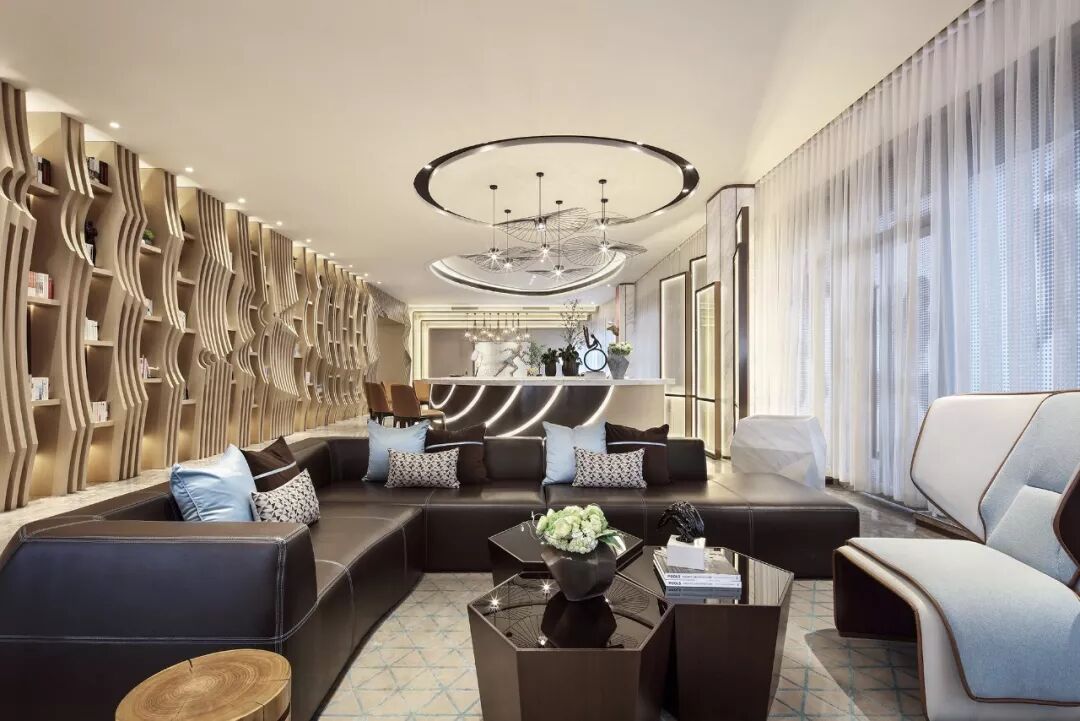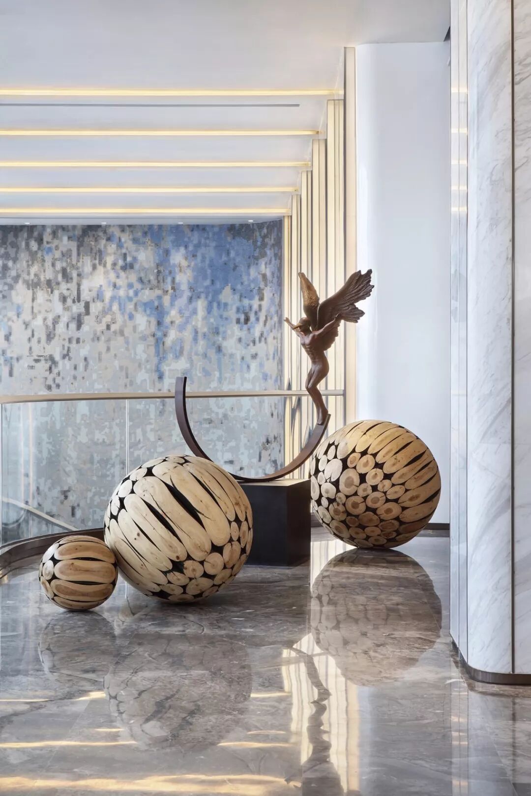 一楼大厅大面积落地窗将室外美景一览无余引入室内,红色运动人物雕塑将视线聚焦于此,极具动感与视觉张力,大型弧形线状吊灯从上而下飘洒而至,打破空间原本沉闷的布局,为空间带来更多生气。