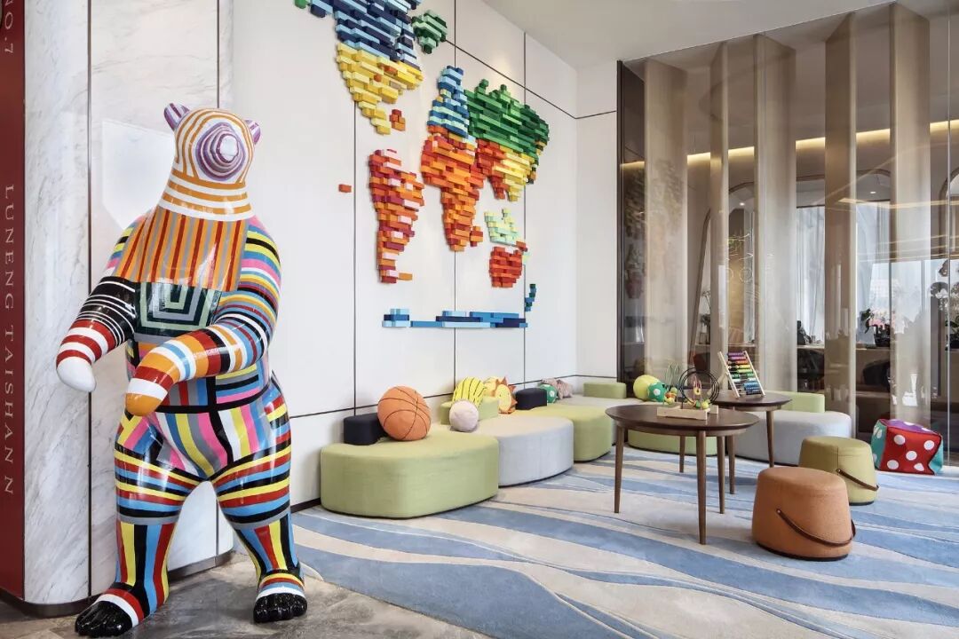儿童活动区以明亮的色彩为主调,以长条造型五大洲,入口雕塑造型充满视觉冲击力,童真元素的置入,提升了空间的跳跃度,以蓝白色为底,使空间不至于过于明晃而引起的情绪波动,重现体现以人为本的人性化设计。
