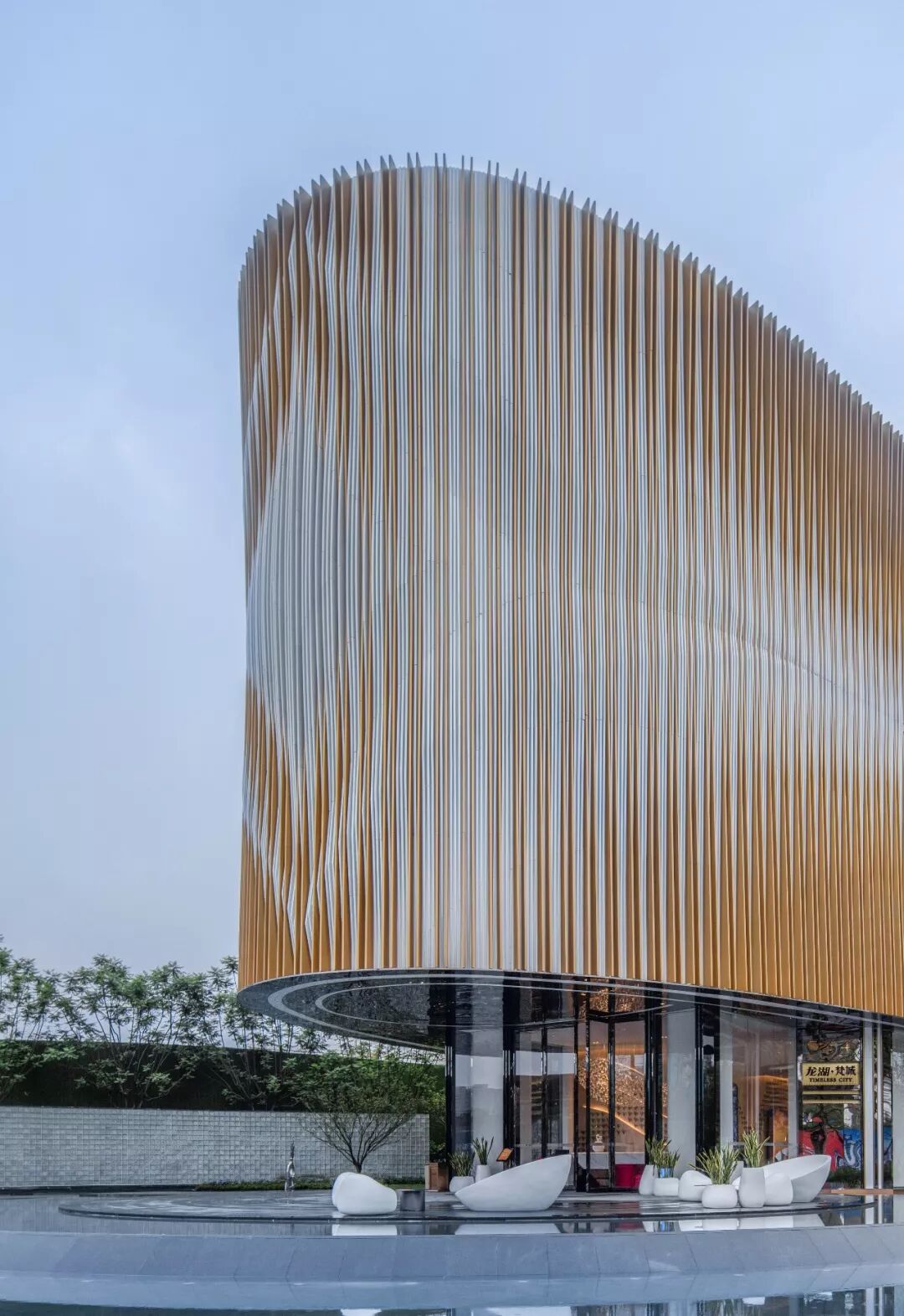 主立面全部是大的弧形延续面,对周边以欢迎却不冲突的态度存在,肌理往街角两侧做无限延伸状,形成延绵的动态变化,步移景异,意喻无尽。