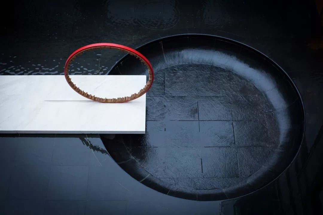 在这个精神空间,奥雅设计结合“海派”情怀,设计了一个红色圆环雕塑立于大理石尽头。